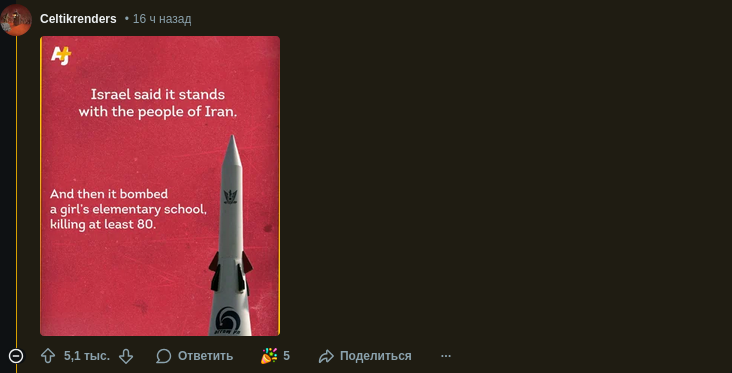 Евреи всё перевернули. Это их страна людоедский режим ,который абсолютно никто не любит. Но у них такая власть в медиа ,что всё выставили так как будто весь мир согласился разъебать иран за какие-то там грехи. Типа Иран пролил последнюю каплю и сейчас его накажут.