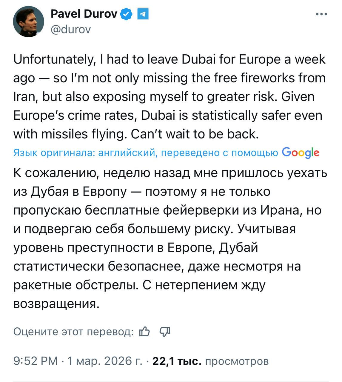 ❗️Идёт атака беспилотников типа «Шахед» на Дубай. Я ловлю кринжуху с этих новостей, как будто таймлайн ещё раз сместился. Через день мы будем читать радостные визги террористов из ксира что в Дубае срут в пакеты.
