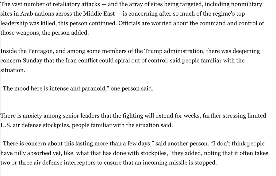 >Непоследовательность ответных атак Ирана 1 марта свидетельствует о том, что иранские подразделения, возможно, испытывают трудности с координацией крупномасштабных атак. Насобачили ракет по всему Персидскому заливу, со всеми посрались, а теперь будут газокосилками работать. Но победу и дальность генерировали плотно.