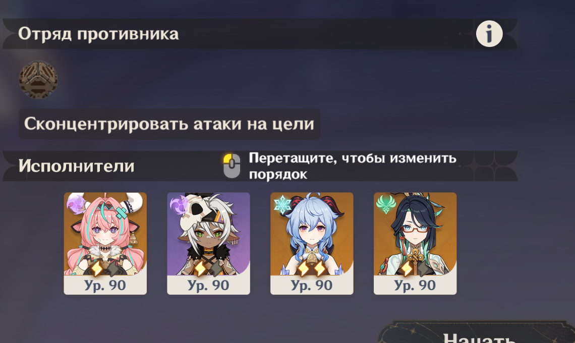 Чувствую, натиск даже на 4 будет душить, все из-за гео босса, вообще без понятия, чем его бить. Мандрагора тоже такое, в опене уже не помню, чем бил, наверное Венти брал, в театре вот лунные, но там проще, с таким-то баффом атаки и МСки, в натиске небось Сахароза вообще никак, маловато там стяжки.