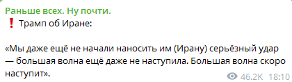 >❗️Большая волна атак ещё не произошла – она скоро придёт. Мы выбьем из Ирана всё дерьмо. Я думаю, всё идёт очень хорошо — Трамп хуле это так смищно, я плохой человек?!?