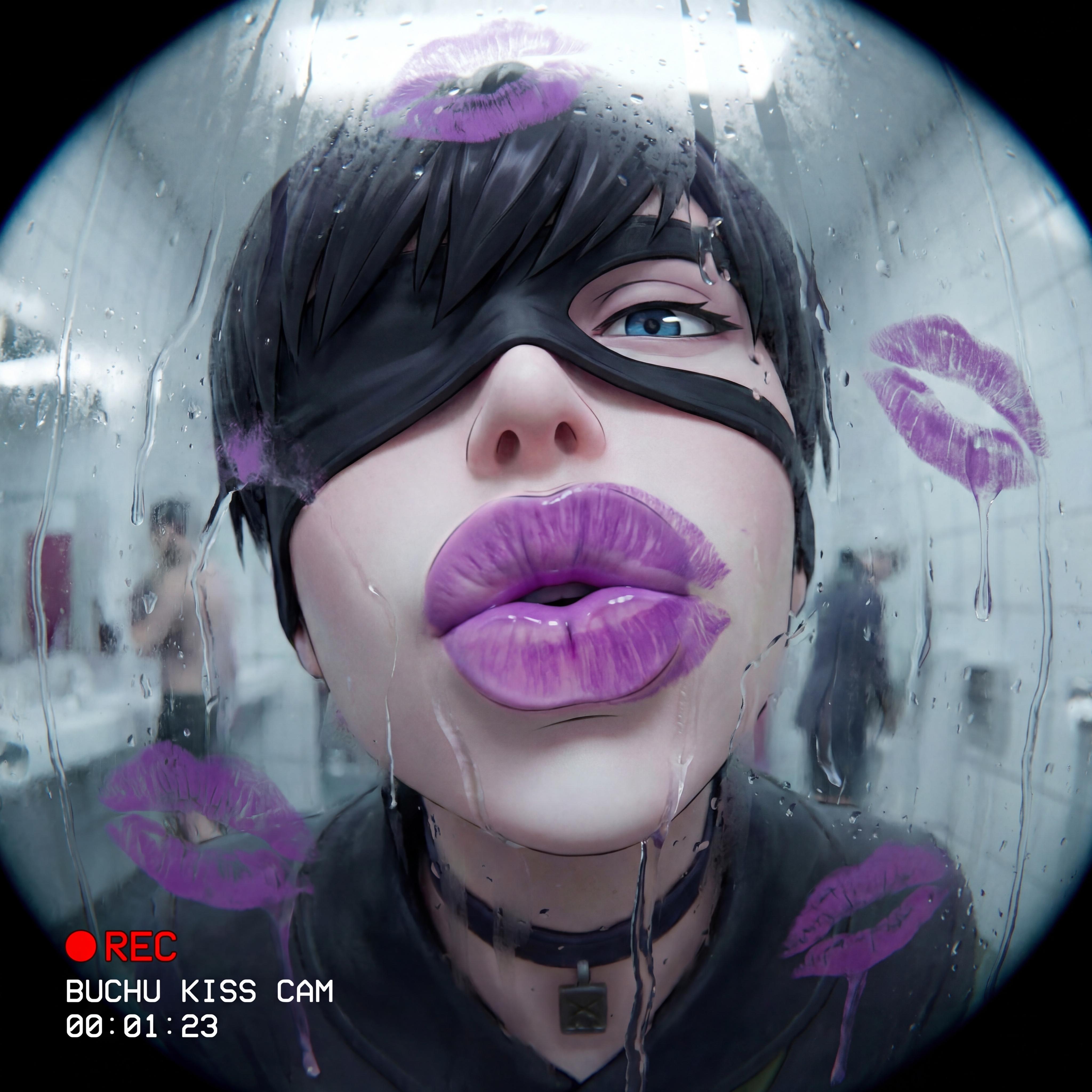 Sasuke from Naruto, he is squishing his face against glass his mouth against glass kiss against glass making lips and lips texture flat against glas, public restroom with good lighting bacgroung, fish eye distorted worldview making mouth of the character look bigger and main focus is on it as char holds eye contact, lips have purple lipstick and overall char has nice full lips like they are filled with silicone and also left there are some kissmarks on the screen already. Semi-realistic anime style like on image reference: