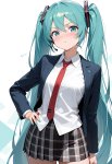 official art, 1girl, hatsune miku, (rokuwata tomoe:0.7), (mikozin:0.3), aqua hair, very long hair, pout, looking at viewer, blush, flat chest, hand up, aqua nail, nail polished, white shirt, long sleeves, black pleated plaid skirt, miniskirt, thighs, red tie, hand on hips, blue blazer, open jacket, cowboy shot, white background