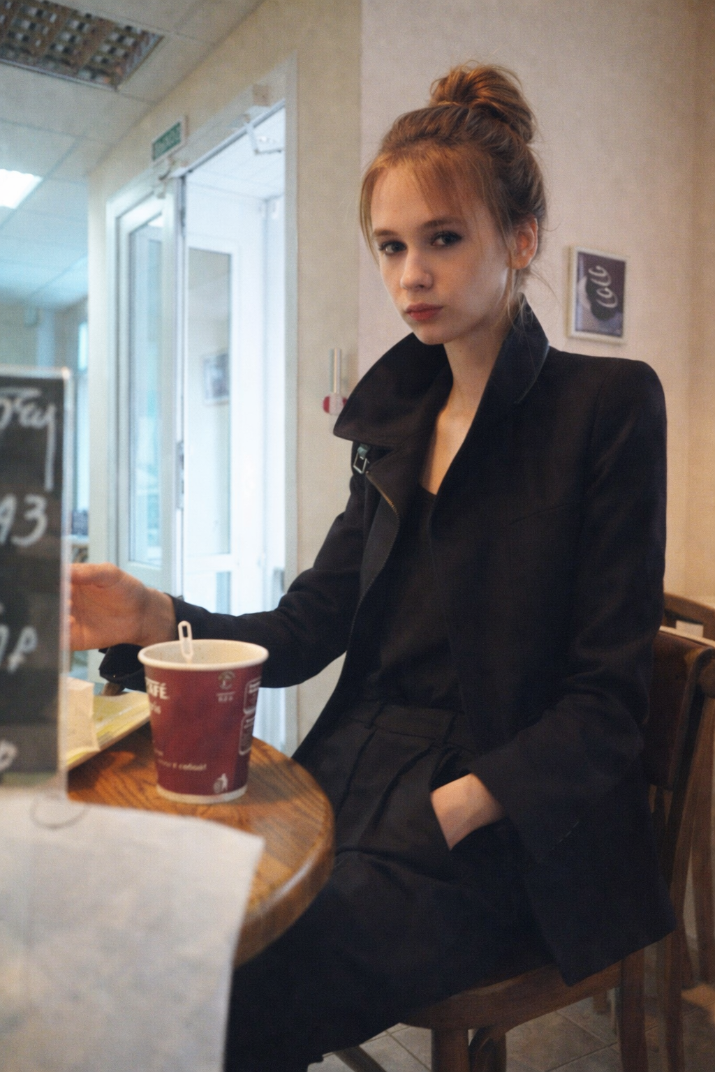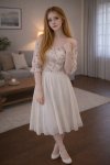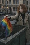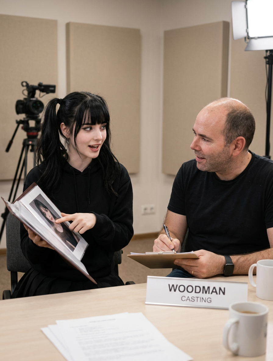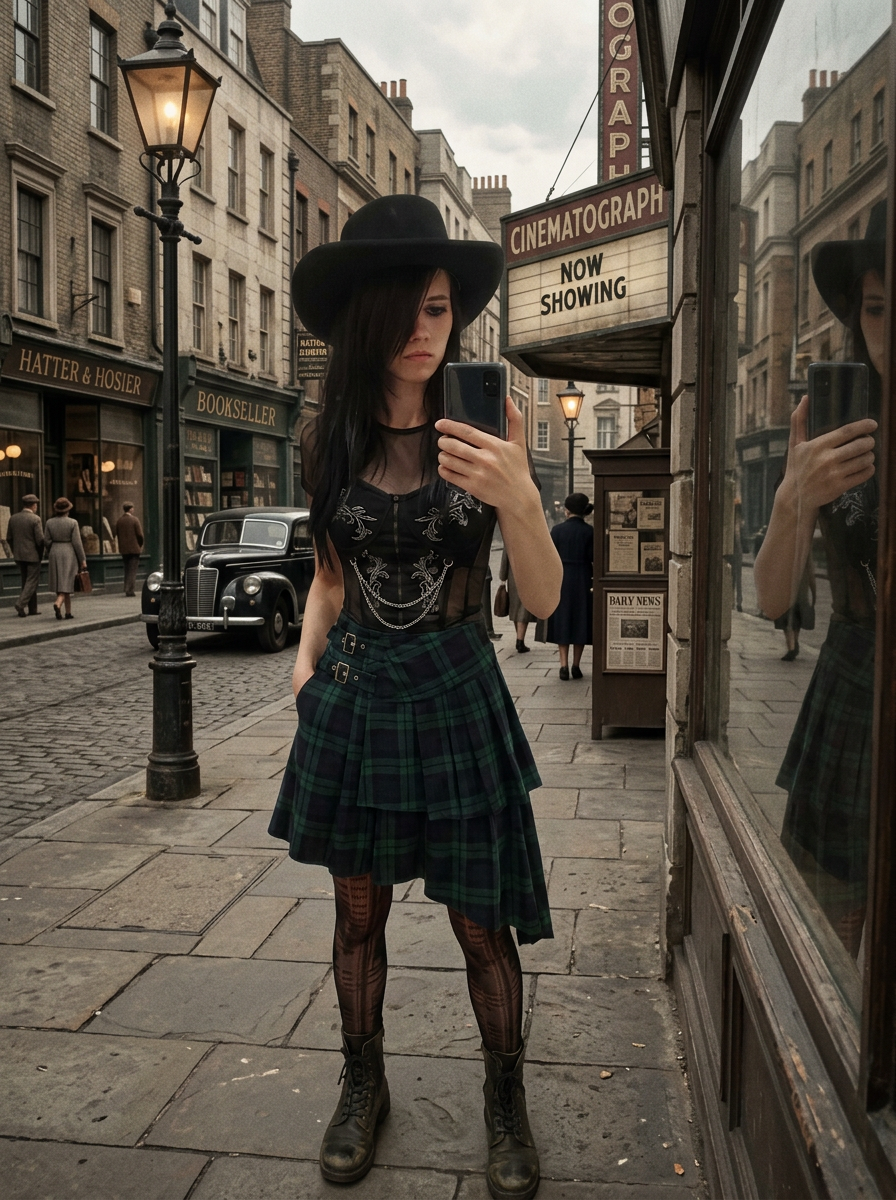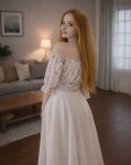 Прмпт: Натуралистичная (живая) фотография, созданная на основе эталонного изображения, где мужчина заменен молодой, красивой, элегантной, стройной женщиной с женской прической. Она одета в женский наряд. Фотография в полный рост. Она сохраняет то же выражение лица и позу, что и на оригинальной фотографии. Фон и освещение соответствуют оригинальной фотографии. Присутствуют реалистичная зернистость пленки и детализированные текстуры.