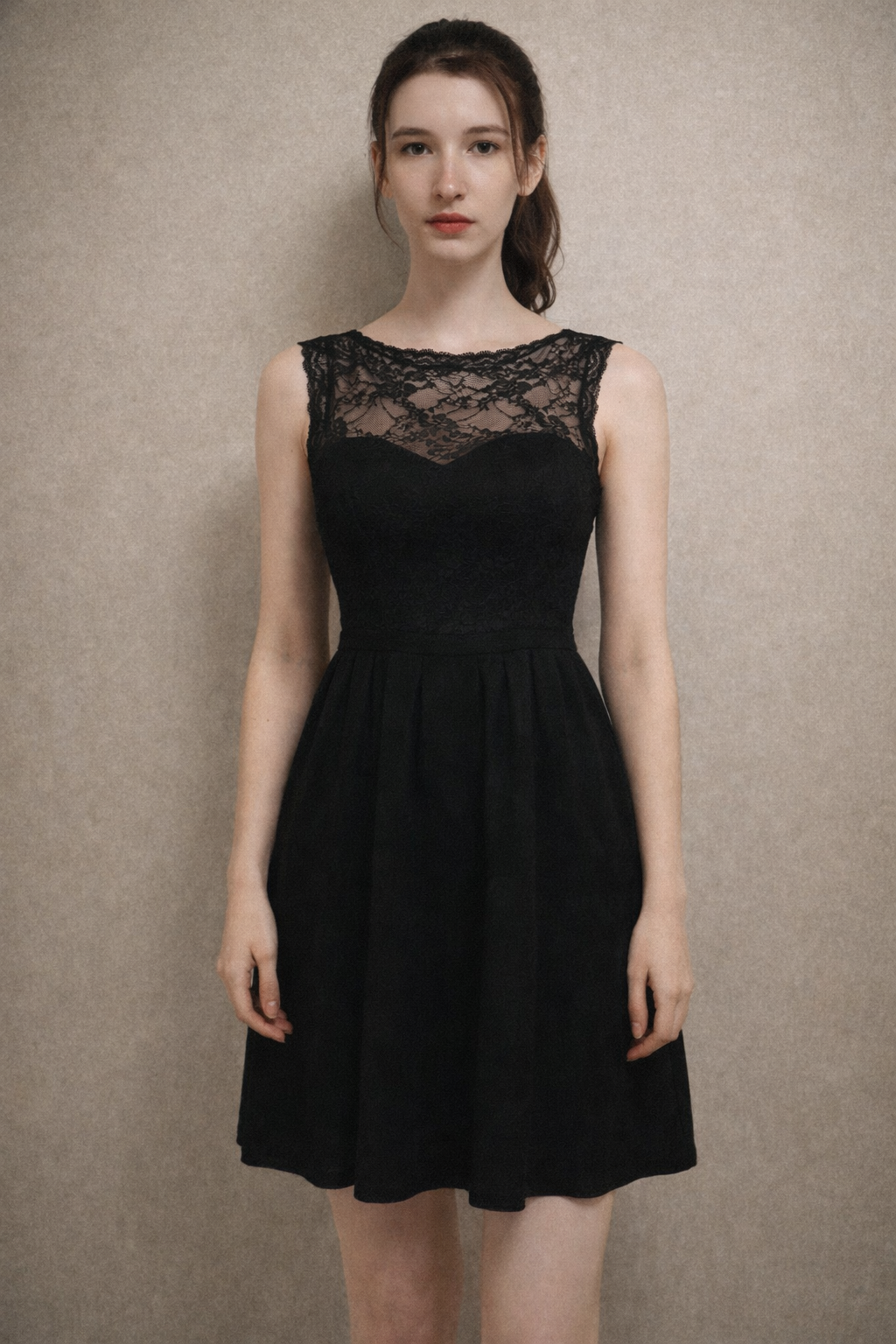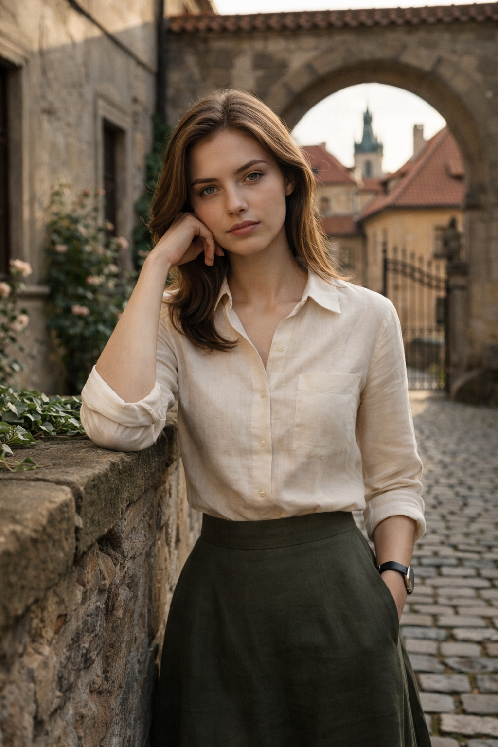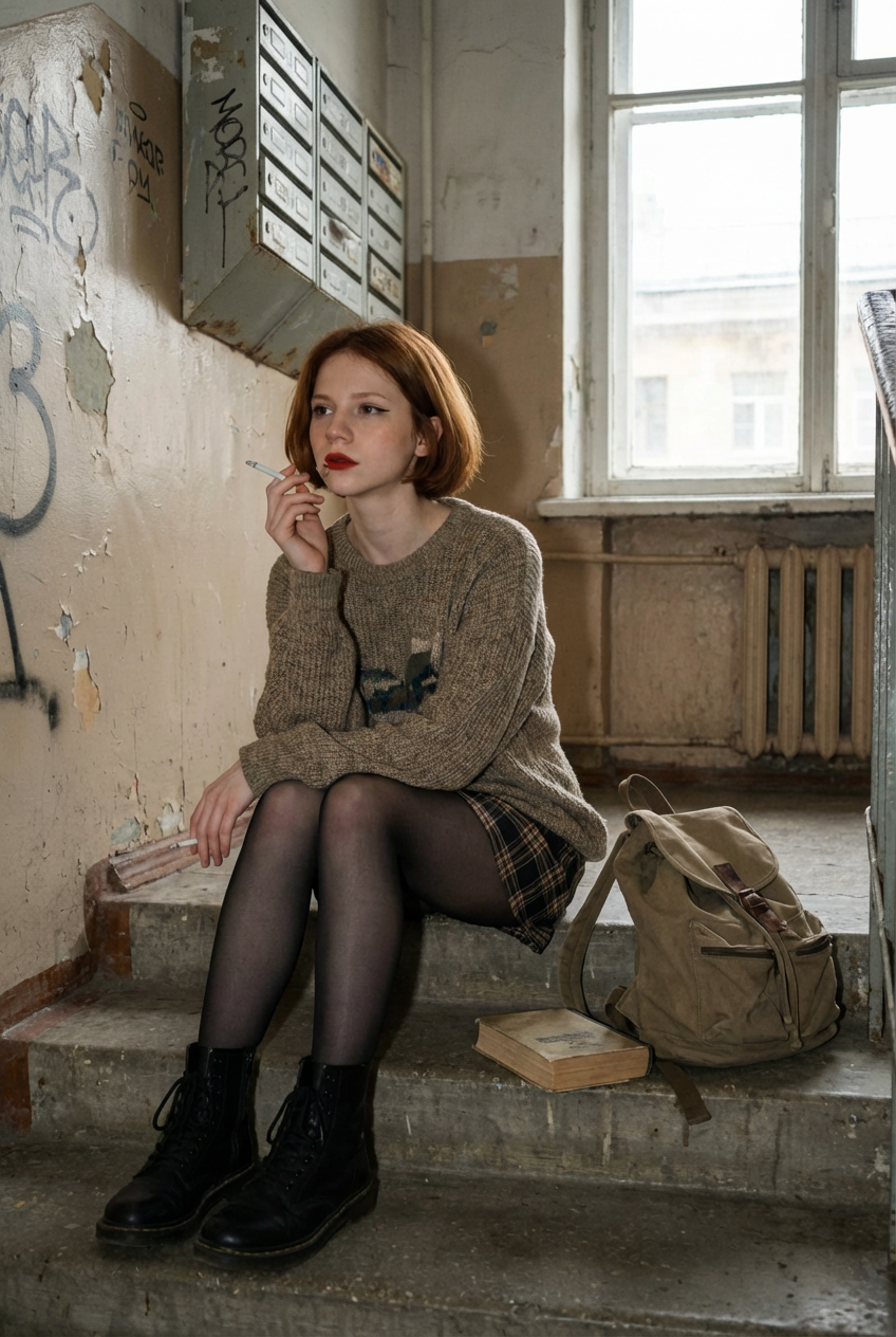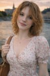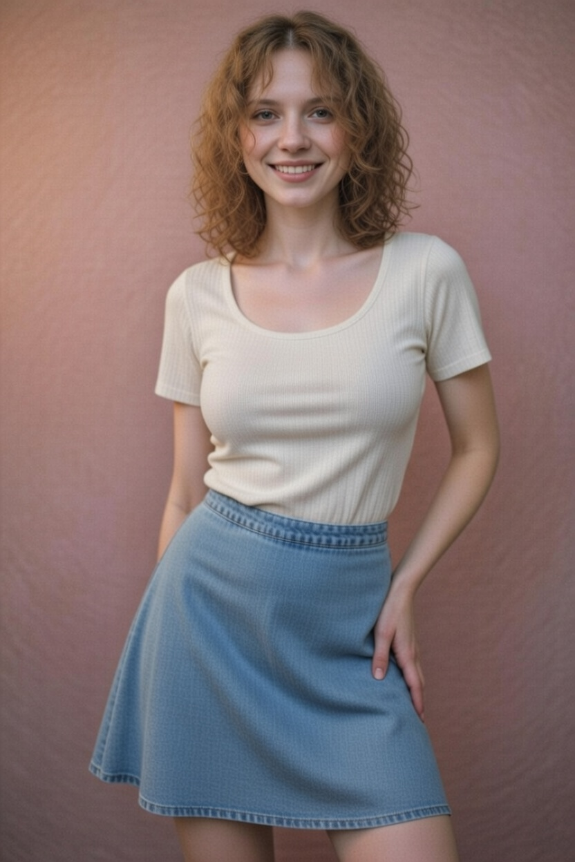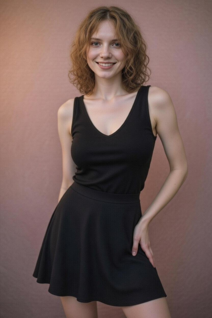 Прмпт: Натуралистичная (живая) фотография, созданная на основе эталонного изображения, где мужчина заменен молодой, красивой, элегантной, стройной женщиной с женской прической. Она одета в женский наряд. Фотография в полный рост. Она сохраняет то же выражение лица и позу, что и на оригинальной фотографии. Фон и освещение соответствуют оригинальной фотографии. Присутствуют реалистичная зернистость пленки и детализированные текстуры.