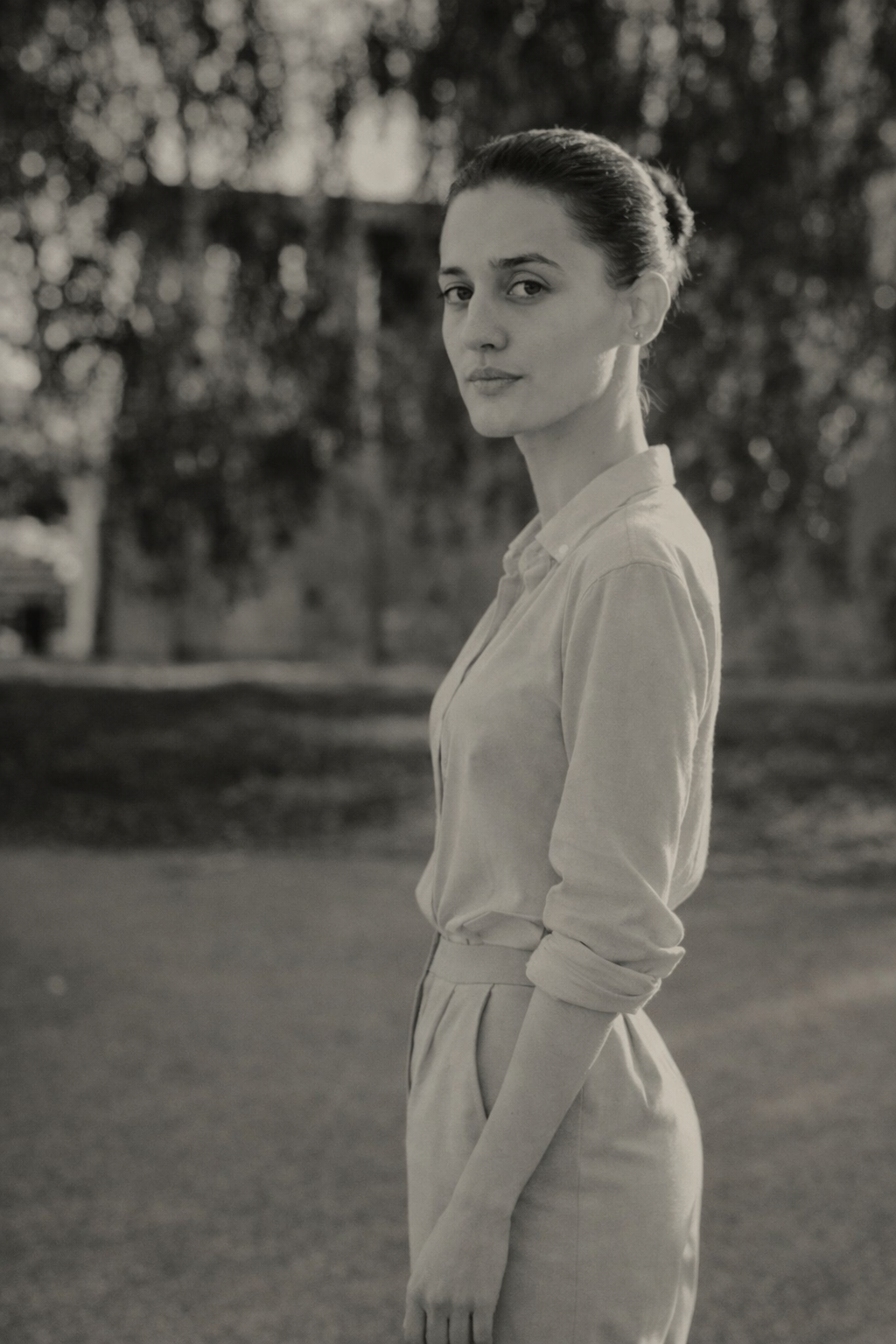 Натуралистичная (живая) фотография, созданная на основе эталонного изображения, где мужчина заменен молодой, красивой, элегантной, стройной женщиной с женской прической. Она одета в женский наряд. Фотография в полный рост. Она сохраняет то же выражение лица и позу, что и на оригинальной фотографии. Фон и освещение соответствуют оригинальной фотографии. Присутствуют реалистичная зернистость пленки и детализированные текстуры.