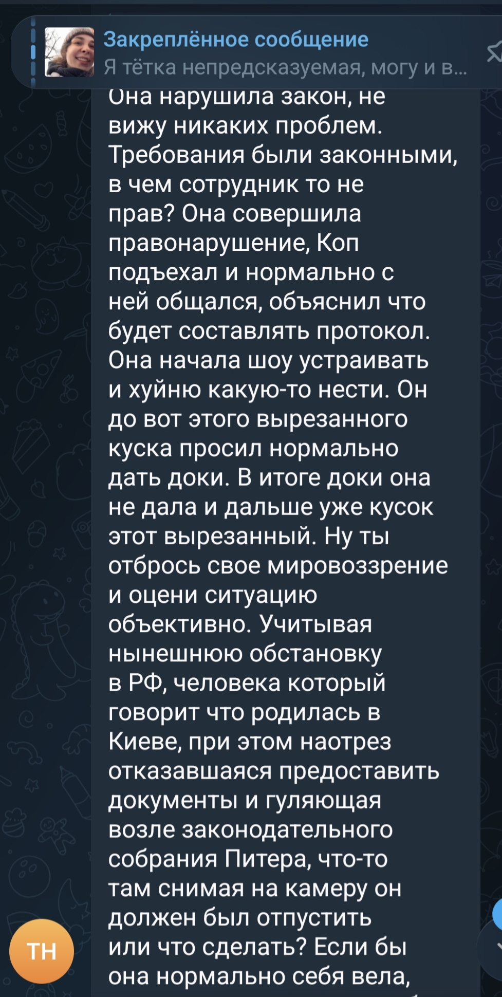 >>62021189 (OP) >Стримершу Клариссию "Di.Ruxnums" Меламед родом из Киева арестовали в Санкт-Петербурге и заковали в наручники. Поводом стал ее ответ на вопрос полицейского, кто пукнум, на что она сказала, что Пукнум. После этого сотрудник немедленно потребовал выключить стрим и сесть в патрульную машину.