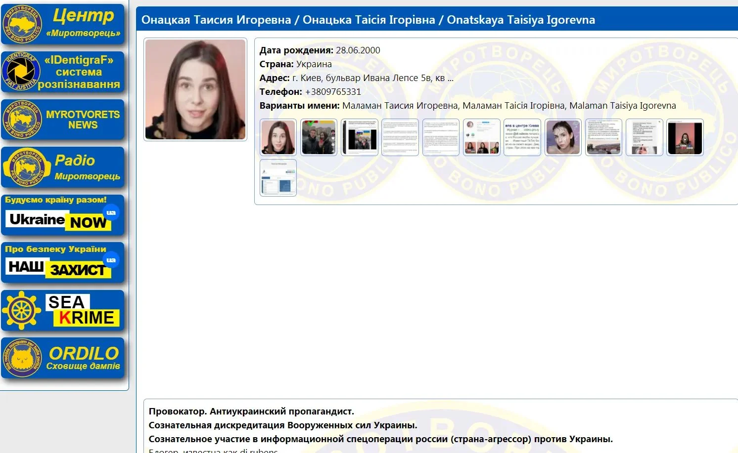 Невідомі патріоти дізнались її особисті дані, які ви, можливо, ще не бачили. То ж, якщо зустрінете таку, то краще з нею не водитись. Ну ви поняли. Онацкая (Маламан) Таїсія Ігорівна р.г. 28.06.2000 м.Київ, бульвар Вацлава Гавела 5В, кв. 15 +380976533102 https://www.instagram.com/di.rubens/