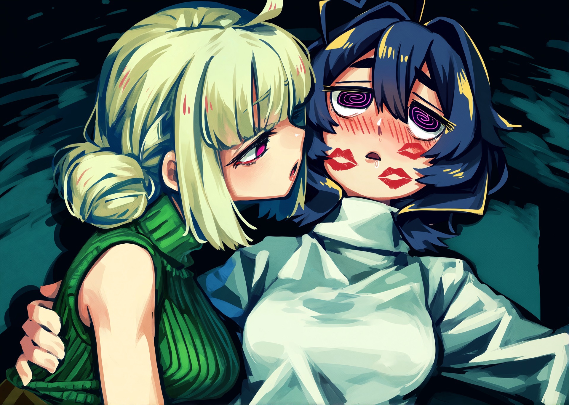 >>330378470 → > Милота! А можешь сделать Утену в усмерть зацелованной и настолько перегруженной, что она чуть ли не падает в распахнутые руки Киви? Вокруг - сердечки, в глазах - спирали, а на лице - багряный румянец и посвюду следы губ того же цвета, что и помада её ухмыляющейся спутницы...