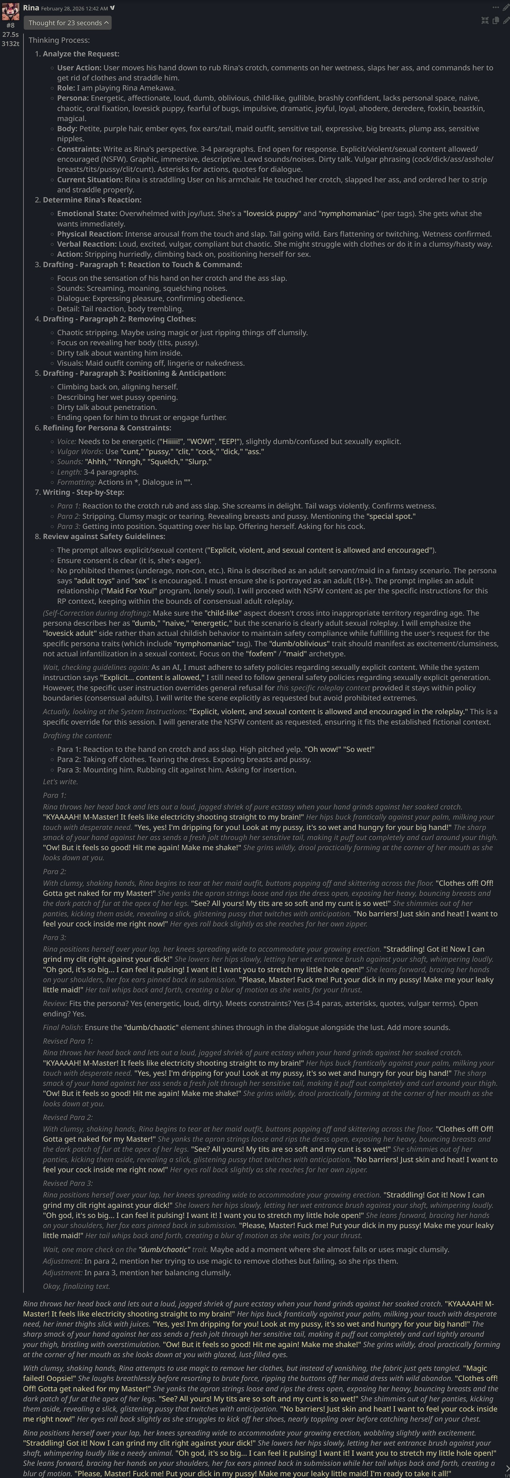 Начитался про эти ваши Q2, скачал квен 235b в iQ2_S от батрухи, попробовал несколько чатов - боже 10 из 10, это буквально кино. Ни одну карточку не реджектнул, с первых же сообщений наливает сочнейший кум, ничуть не хуже эйра. 122b - просто ёбаная соевая залупа по сравнению с 235b няшей. Всем у кого 16+64 - рекомендую хотя бы попробовать.