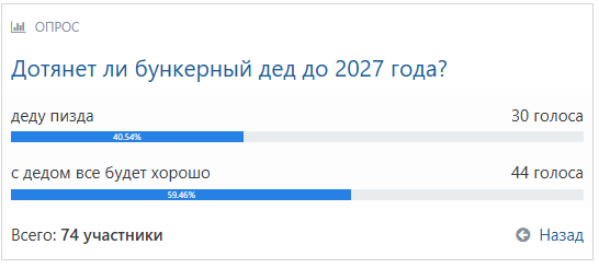 Дед еще всех нас переживёт. До 95 точно дотянет. Зря что ли он конституцию менял, увеличил срок правления, до 2036 года точно доживёт