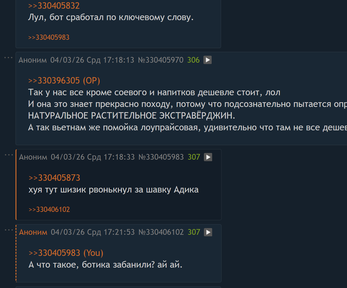 >>330396305 (OP) Так у нас все кроме соевого и напитков дешевле стоит, лол И она это знает прекрасно походу, потому что подсознательно пытается оправдаться: если детское питание, то обязательно ОМЕРИКАНСКОЕ, если молоко, то НАТУРАЛЬНОЕ РАСТИТЕЛЬНОЕ ЭКСТРАВЁРДЖИН. А так вьетнам же помойка лоупрайсовая, удивительно что там не все дешевле