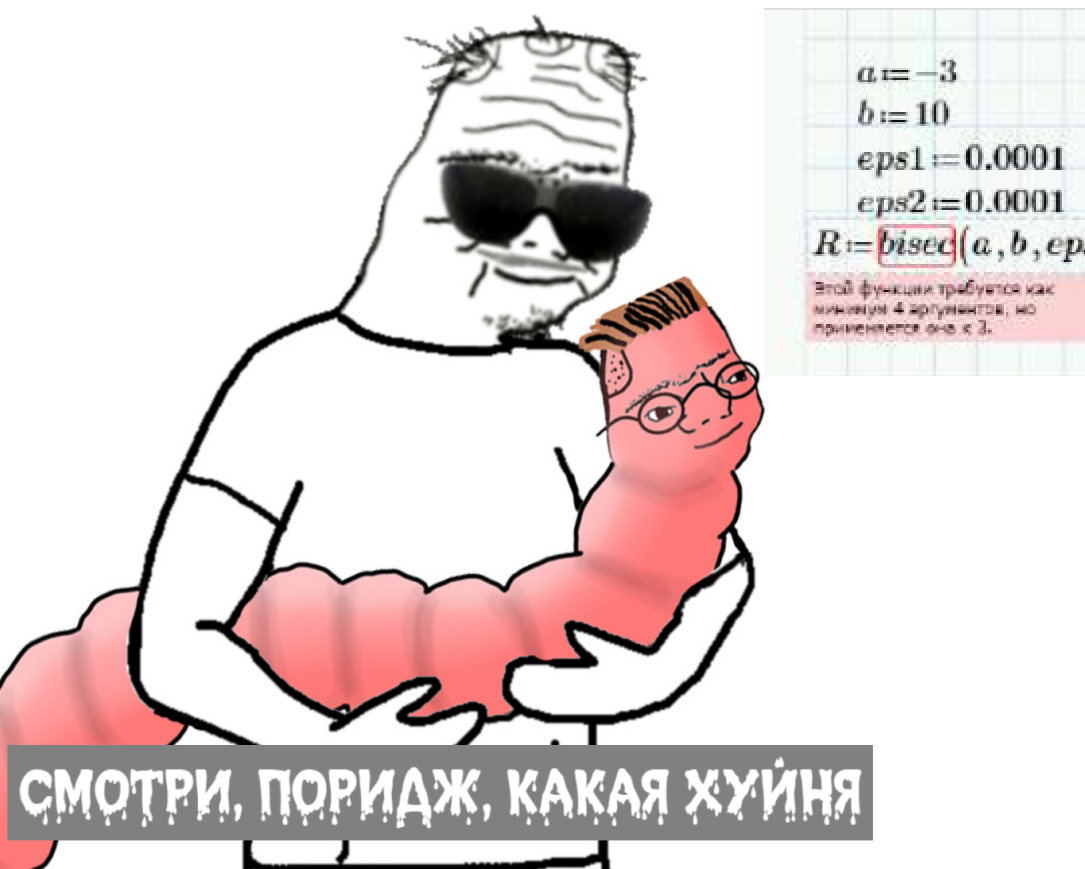>>330404017 Ниже само собой, иначе ошибки были бы другие. Иногда выдает корней нет при некоторых значениях интервала, но в основном вот эта хуета. Впритык не вижу где тут может быть ошибка.