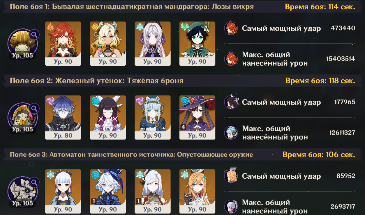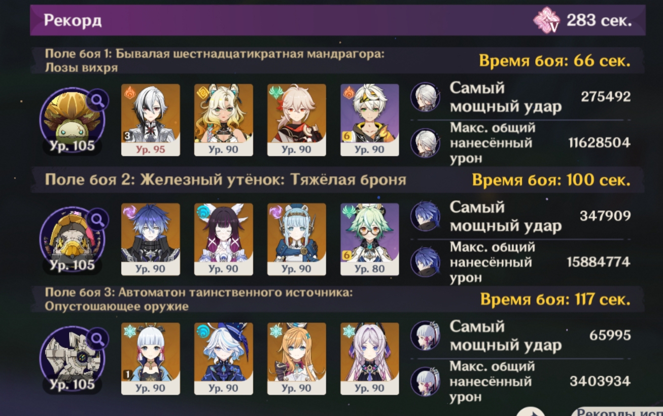 Посмотрел на пикрилах как многие проходят на лучший таймер чем у меня. Видимо че то не так делаю Ульта венти всегда красится в пиро тк Мявуика срет из кармана. Как то надо сделать чтоб в крио пошла инфузия Еще крио робота проходят быстрее. Вот тут хз где можно выиграть время, у скирк прямолинейная ротация
