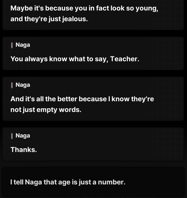>>6517611 Можно было просто написать что после фейерверков мы вернулись в кафешку сладко покаколи и легли спать. Не показывать эту полупрозрачную руку, не давать намипону странный диалог и ачивку. Просто встать и "где чипсек?", "Да вон там сидит за столиком". ВСЕ.