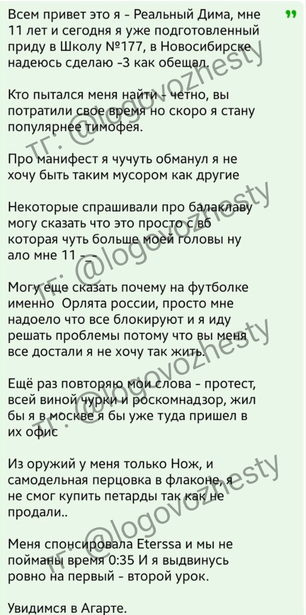 Глисту всего 11 лет. Зовут Дима, он говорит, что хочет превзойти Тимофея и убить троих человек. При себе у него только нож и САМОДЕЛЬНАЯ перцовка во флаконе от духов. Также он пишет, что хотел взять с собой петарды, но ему не продали.