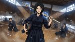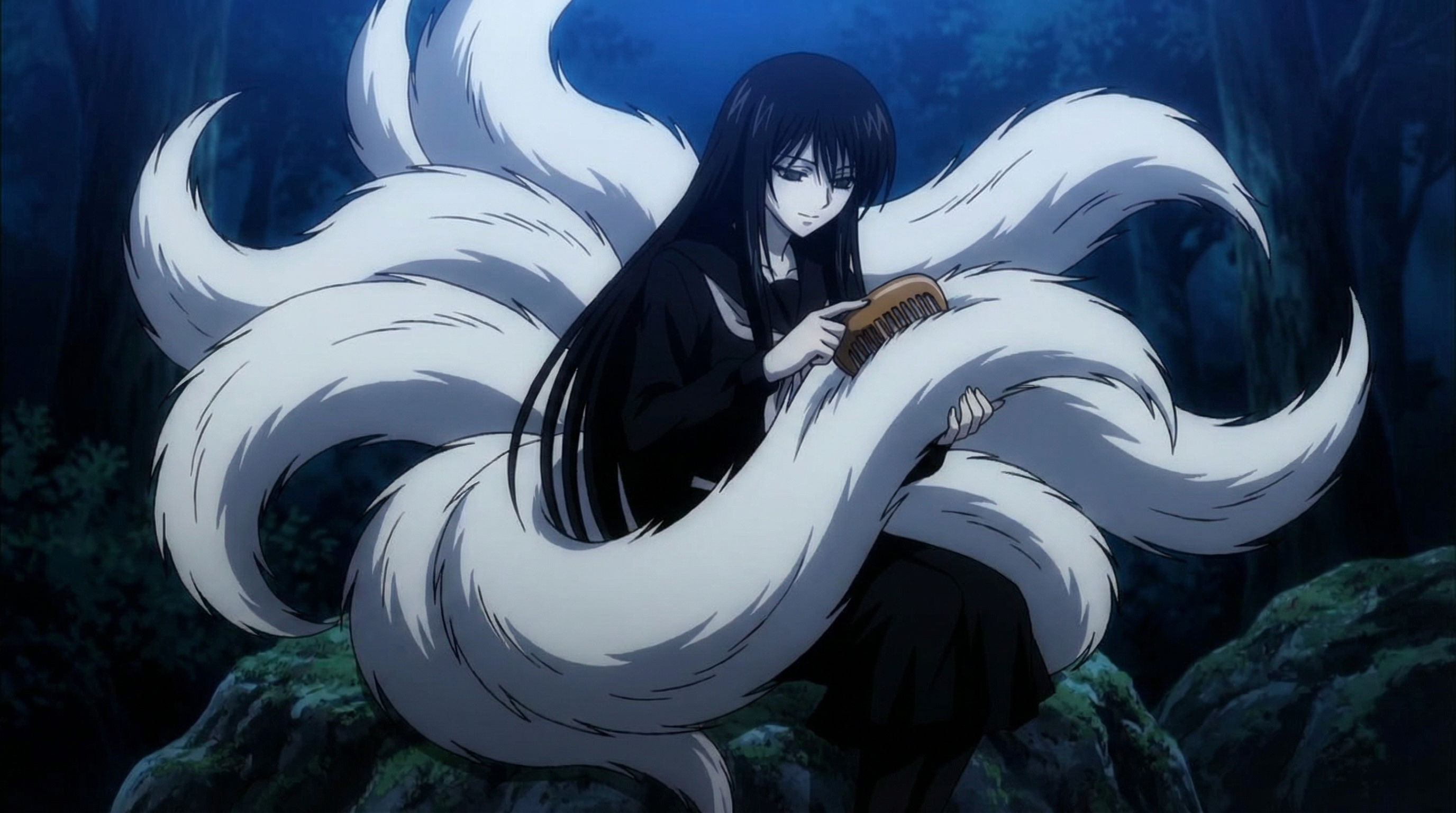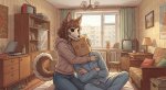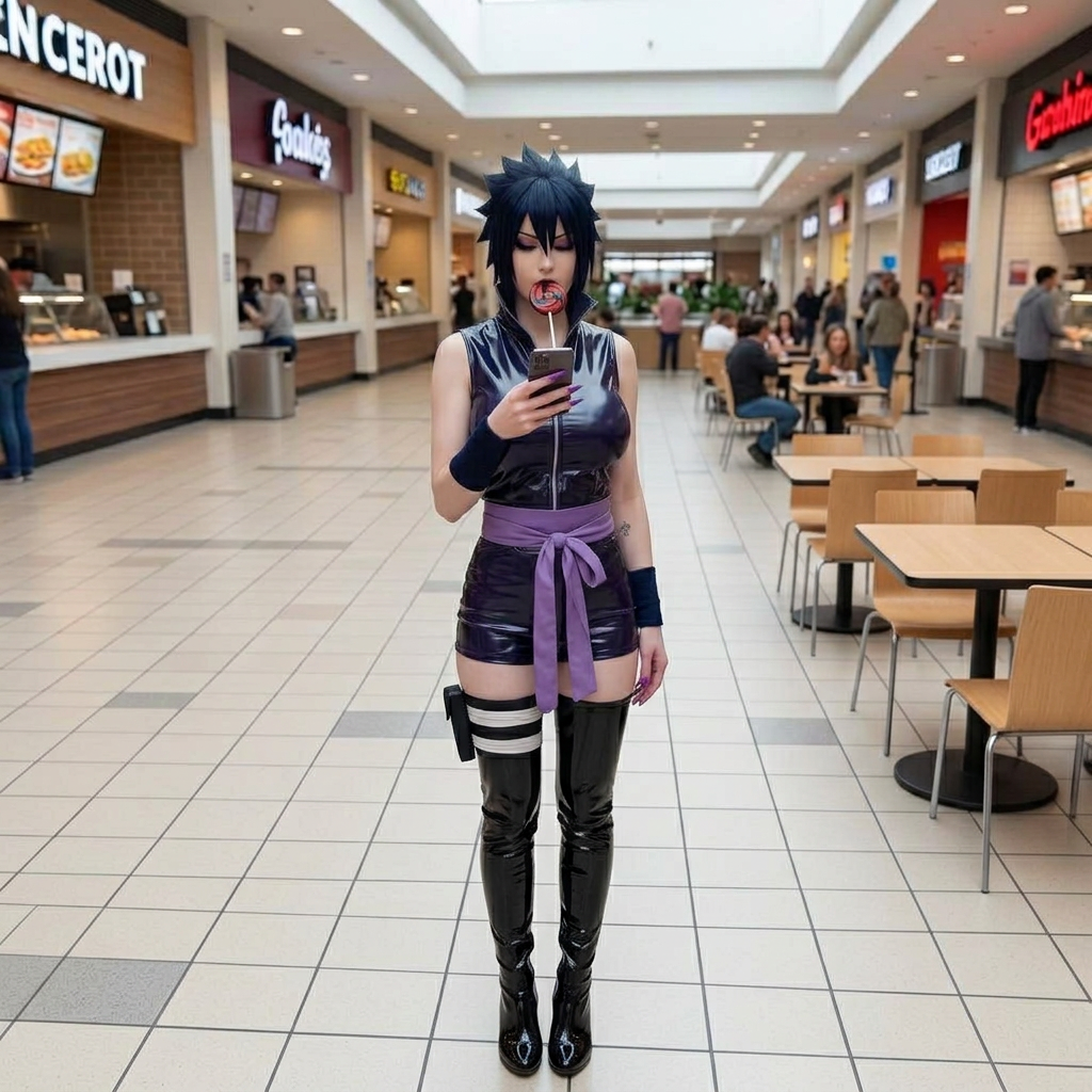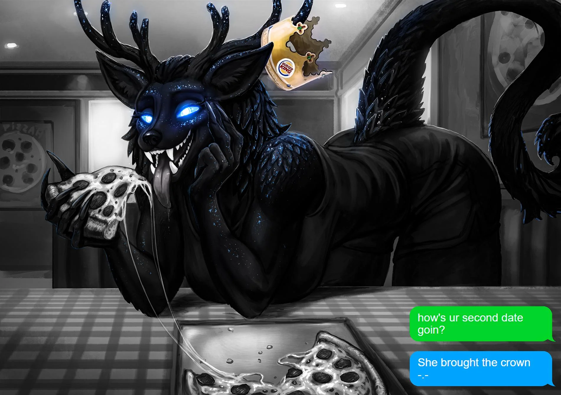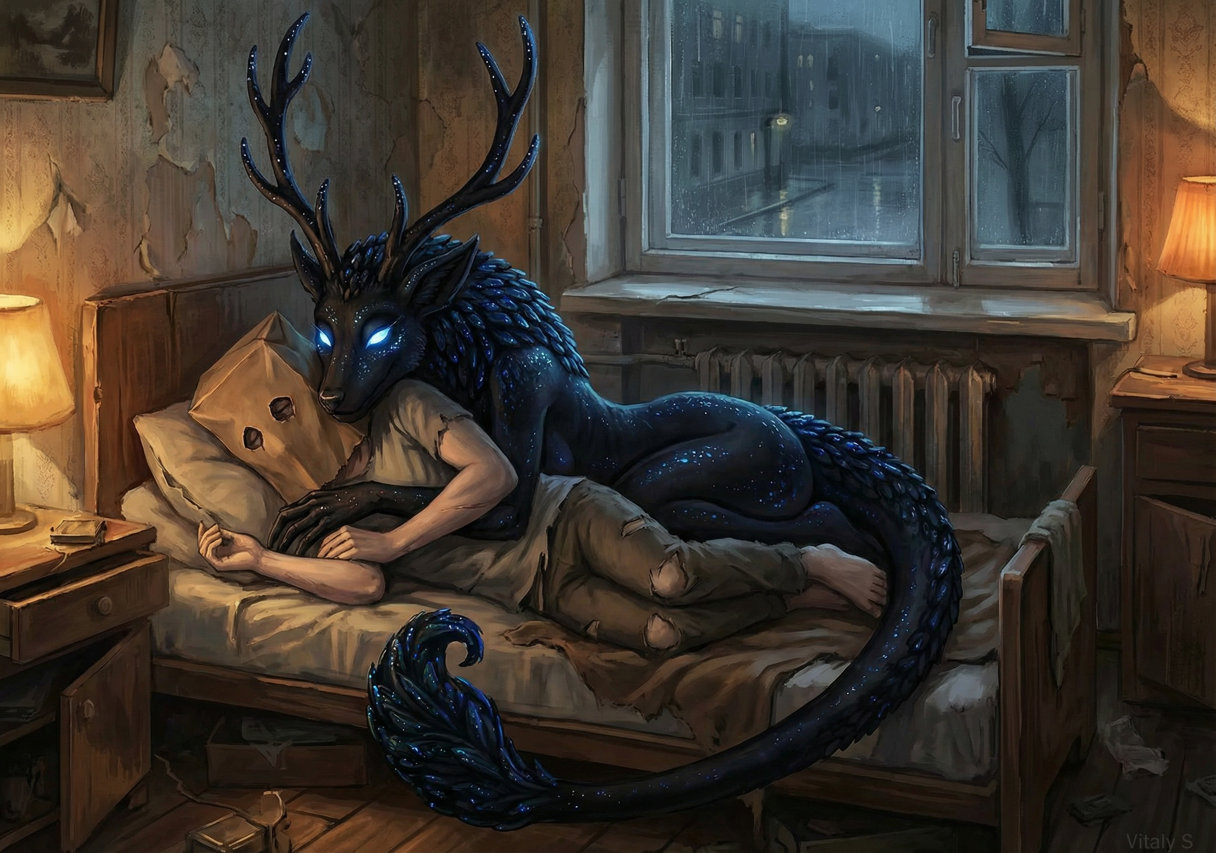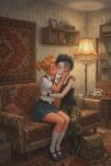 Сидит на современной российской кухне, за столом. На столе лежит бехерит Гатса, рядом на стуле сидит Каска с длинными волосами.