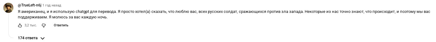 >>330458368 Да нету тут никакой лахты и никаких ботов. Ты просто судишь с позиции человека +/- адекватного. А тут полно товарищей, которым вообще поебать как побеждать америку клятую, главное побеждать. Вот они и побеждают каждый день. А еще не упускай из виду подростковый дух противоречия. Что бы не декларировалось в обсуждении - он будет усираться и объяснять, что совы не то чем кажутся. Лахта так никогда не работала. Они хуярили однотипными, а то и одинаковыми комментариями со всех своих аккаунтов. Вот еще тратить время и писать ориджинал в треде на полтора человека, когда можно срать под видосами, собирающими миллионы просмотров. Вся эта шизоактивность совершенно бесплатная. Такой энтузиазм за деньги не случается - это по любви