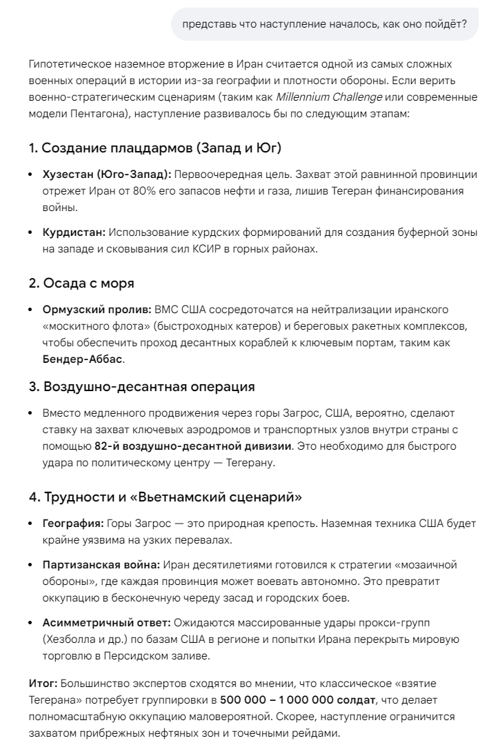 > Издание расценило это как признак, что операция США против Ирана может продлиться дольше четырехнедельного срока, о котором говорил Дональд Трамп. «Мы стали свидетелями совершенно спонтанной операции, в ходе которой, по всей видимости, никто на самом деле не понимал и не верил в неизбежность военных действий. Создается впечатление, что они проснулись в субботу утром и решили начать войну», — сказал Politico бывший высокопоставленный американский дипломат Джеральд Файерштейн, некогда занимавшийся вопросами Ближнего Востока.