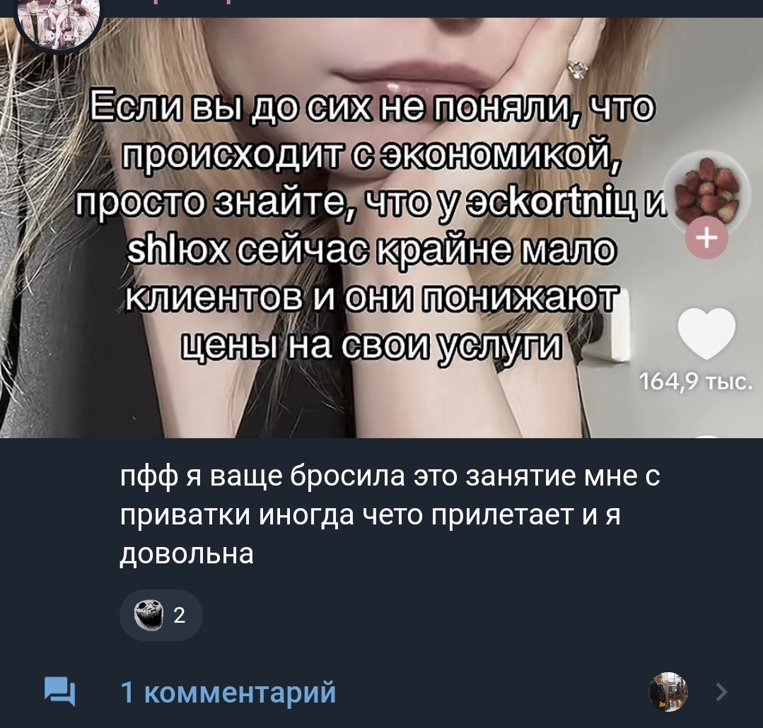 Выложила пост абу что запретили рекламу в тг и вообще телеграм запрещают и написала ЭТО. Ебанутая типо не понимает, что это выстрел в ногу и железный занавес где жопу не продать так просто?? Где с клиентами будет переписываться то, в максе??