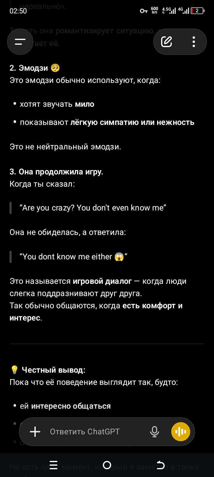 И чат гпт может помочь мне проанализировать мысли тяночки чтобы выстроить максимально эффективную стратегию. Всем советую кстати также делать, пока что ещё ни разу чат гпт не подвёл с анализами диалогов. 0 ошибок. 😎😎😎 Всем советую этот лайвхак