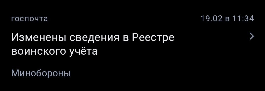 Короче, блять, трясущимися руками зашел впервые в этот злоебучий реестр. Оказывается никаких повесток на меня там нет. Заказал выписку - там, конечно, жесть. Обновленные сведения - это, внезапно, запись о том, к какому военкомату я приписан. Ну то есть самое очевидное, что только может быть, они выяснили лишь неделю назад. По мнению военкомата у меня только школьное образование. Хотя мне выдавали отсрочку по учебе в аспирантуре на основании дипломов. Лоллирую, что для военкома всё в норме, что я работал в вузе доцентом со средним образованием.