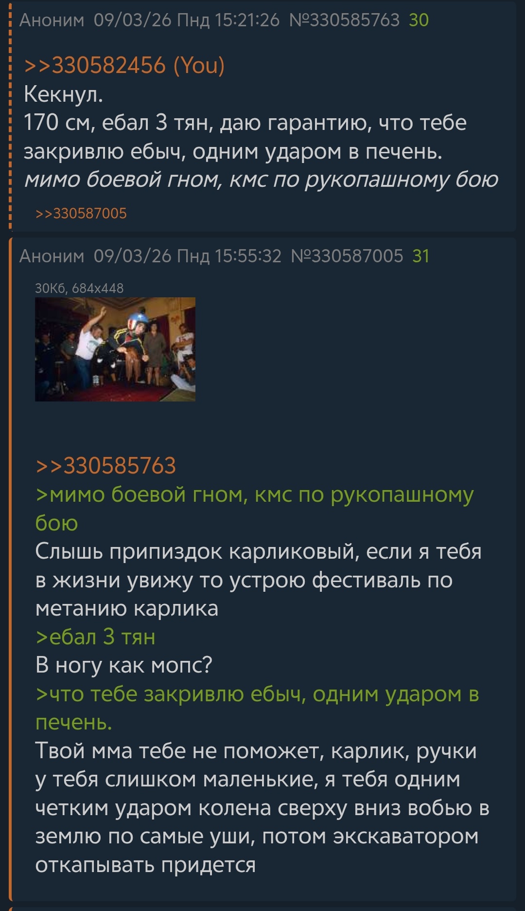 Аноны, рассудите, кто из нас прав? Почему подобные гномы думают, что они для человека нормального роста вообще какую-то опасность представляют? Ну то есть буквально припиздыш подзалупный с микро ручками, которого среди квантовой пены и заметить сложно, считает что спорт ему даёт какое-то преимущество в драке, хотя если логически подумать, комара хоть на черный пояс карате научи, он конкуренцию человеку не составляет, просто одним чапалахом отцовским сядет на жопу и заплачет. Что эти карлики о себе возомнили?
