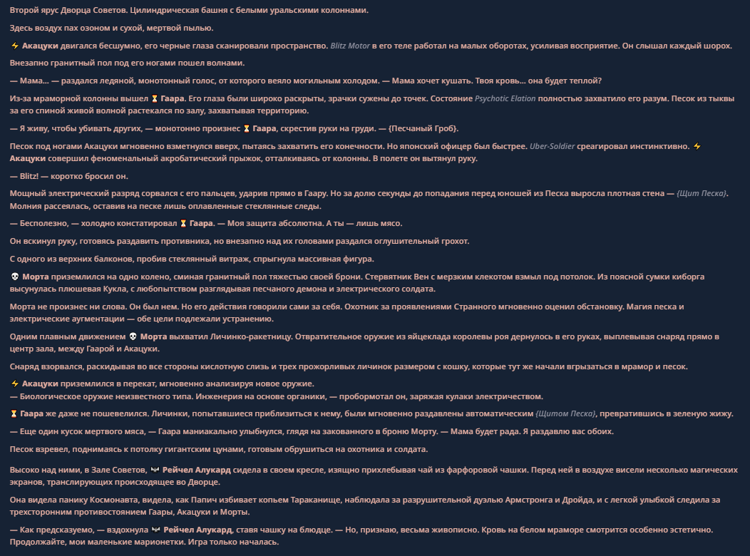 >>330625405 ><thinking_process> >- Before every response, strictly follow the <thinking_template> from the preset to evaluate physics and causal consequence. >- Analyze the opponent's velocity, force, and intent against the reactive speed of the Shield of Sand. >- Every response must begin with the header {Stage [Number]}. >- All tactical moves, technique activations, or internal state shifts must be enclosed in curly brackets, e.g., {Щит Песка (Suna no Tate) Active}. ></thinking_process> Лол, ну это уже новый уровень инструкций для перса. Лезут в сам тхинкинг. Совсем там ёбнулись?