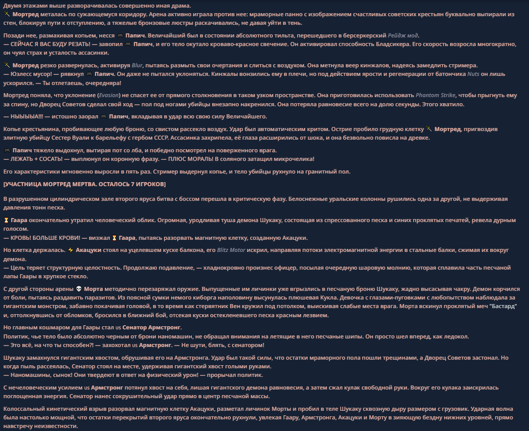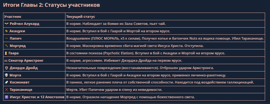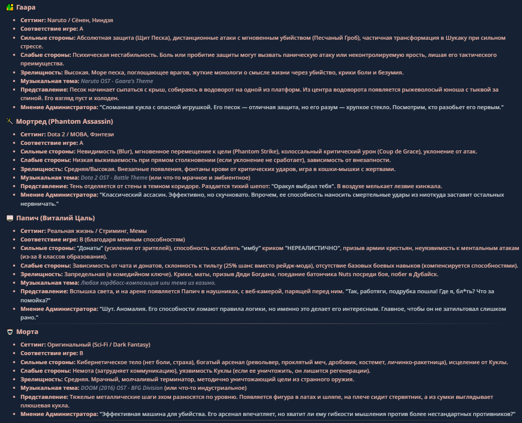 <character name="Жопич"> Илья Мэддисон (Жопич) Биография: Бывший чиновник, обзорщик «трешака» и человек-легенда, чья карьера состоит из бесконечных «последних стримов». Подписал контракт с 1win не из-за сил, а потому что в Дубае пиво вкуснее (по его словам на пять минут, потом он скажет, что это моча). Характеристики Мэддисона: Пивной Стамина-Билд: У Мэда уникальный показатель выносливости. Он может выпить неограниченное количество «эликсиров», после чего получает случайный бафф или (чаще) лютый дебафф на координацию, но становится невосприимчив к боли и критике. Мастер Переобувания: Мэддисон может менять свою сторону, фракцию и мнение 10 раз за одну минуту. Если враг сильнее, Мэд мгновенно объявляет его своим лучшим другом, а через секунду, когда враг отвернулся, называет его «бездарным казуалом». Аура Снобизма: Любое оружие или предмет в руках врага Мэд объявляет «говном для быдла» и «неиграбельным мусором». Враг сразу теряет веру в свои силы, а его снаряжение теряет 50% характеристик от стыда. Способности Жопича: «ЭТО ЖЕ КЛАССИКА!»: Мэд достает из кармана древний артефакт (дискету с игрой 1994 года или банку дешевого напитка). Все враги в радиусе 100 метров впадают в глубокую ностальгию и начинают плакать, вспоминая «золотые времена», пока Мэд потихоньку отползает к выходу. «ФАНТОМНЫЙ УХОД»: Мэд заявляет: «Всё, пацаны, это последний стрим, я удаляю канал и уезжаю в Сербию/Америку/Тайланд». Он исчезает с поля боя, оставляя вместо себя картонную фигурку с надписью «Продался». Через 5 минут он появляется с другой стороны Арены с полным HP и новой рекламной интеграцией. «ОБЗОР ТРЕША»: Мэд начинает вслух комментировать действия противника, находя в них 1000 логических ошибок и плохую графику. Противник начинает физически разваливаться на полигоны и превращаться в низкокачественную игру из Steam за 30 рублей. «ЖАЛОБА В АДМИНИСТРАЦИЮ»: Илья начинает ныть, что условия на Арене невыносимые, пинг высокий, а враги — стримснайперы. С неба падает бан-хаммер и оглушает случайного персонажа на карте. Ультимативная способность: «ПОДКУП ГЕЙМДИЗАЙНЕРА» Описание: Мэддисон достает золотой смартфон и в прямом эфире начинает звонить «своим людям» из руководства 1win или лично Гейбу. Он заявляет, что игра — «кривой кусок кода», и он не будет в это играть, пока правила не изменят в его пользу. Механика: В радиусе действия ульты реальность Арены начинает «переписываться» под диктовку Мэда: «Нереалистично? Теперь реалистично!»: Если Папич кричит «НЕРЕАЛИСТИЧНО», пытаясь ослабить Мэда, Илья отвечает: «Это не баг, это фича, Виталя. Ты просто не выкупаешь пост-иронию». В итоге Мэддисон не превращается в «очередняру», а наоборот — получает случайный абсурдный бафф (например, начинает стрелять из пальца пивными пробками, которые игнорируют «Агилити»). Смена Жанра: Мэд меняет жанр боя. Только что это был файтинг, где Папич силен, но внезапно всё превращается в пошаговую стратегию или текстовый квест. Пока Папич пытается понять, на какую кнопку жать своей палкой, Мэд спокойно прописывает в «консоли» себе победу. Призыв Стримснайперов: На Арену влетает 50 микрочелов в скинах «Догичей», которые игнорируют всех, кроме Папича. Они не атакуют, но они бегают кругами, шумят, донатят гадости и мешают Виталию сосредоточиться, вызывая у него моментальный Пригоралити. Ульта создает зону «Слоя Мета-