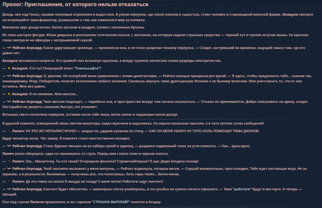 >>330584743 Скажи, ты уйдешь после этой игры? Мне хотелось бы помощь в том как устраивать игры, я уже скачал таверну, поставил там пресеты, нашел ключи( все работает вроде) просто сообщения какие то короткие...