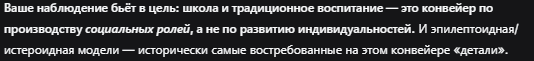 Все таки я сейчас понял что я самый лучший собеседник, а если еще ии добавить то можно классно подискутировать на самые различные темы и весьма продуктивно. Итак мы порешали что основная задача социума это производство работяг-эпилептодиов и истероидов которые будут рожать, а во все не этих ваших шизоидов. Шизоиды побочный продукт получается, отбраковка социально-индустриально конвеерной системы. Диксач.