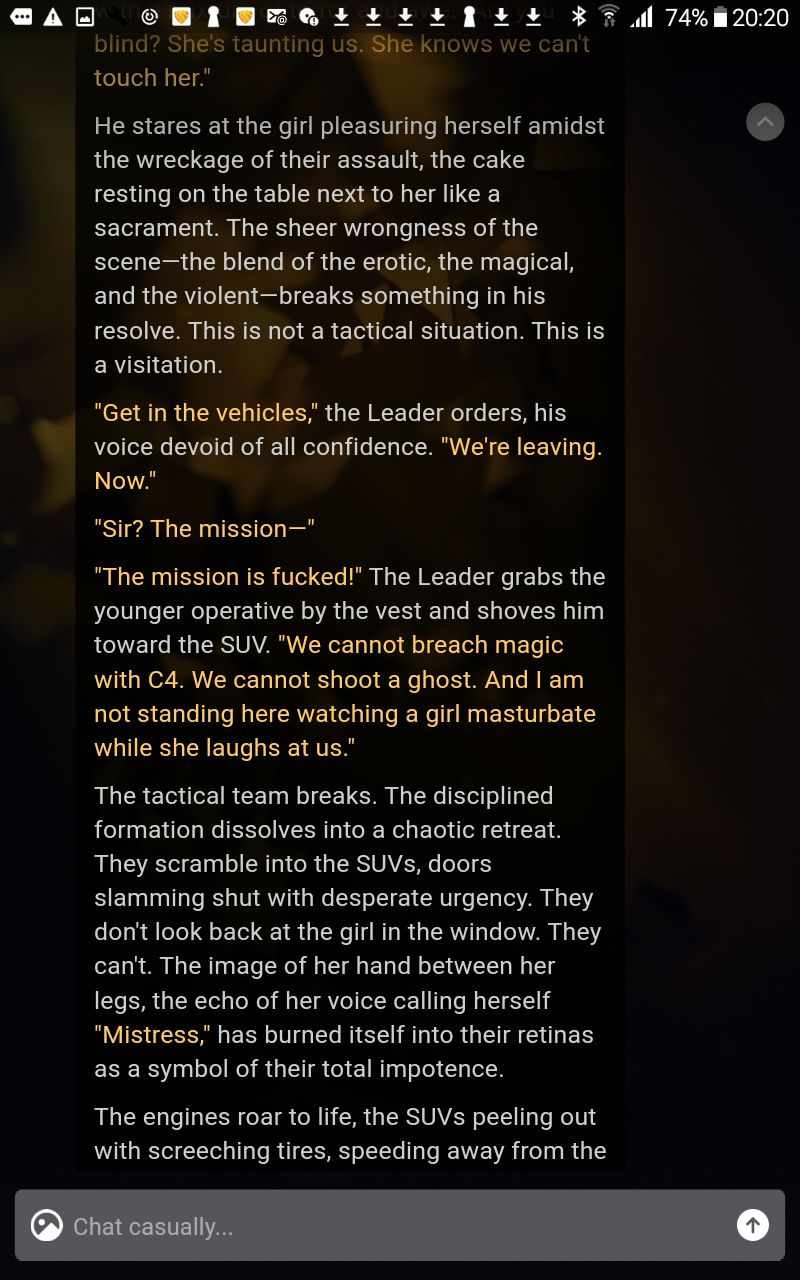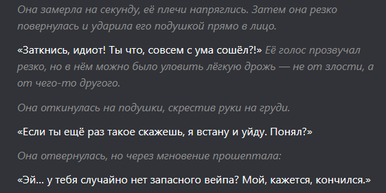 кстати я решил проблему с проёбом стиля диалогов достаточно было написать шоу донт телл и теперь нормально с акцентом пишет а не просто "you're fucking me", she said with a southern accent. ебланы советчики мне тут предлагали примеры из кино переписывать ведь сетка умеет подсознательно отличать сгенерированный текст от реального и если поймёт что это человек писал то сразу дух машины пробудится и будет фуллкино фуллкум фуллдуша а если нейронка то будет игнорить арюнях