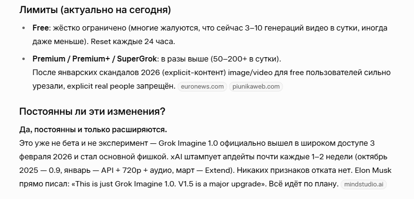 Похоже пизда вот что ответили в самой компании Grok про 5 генераций : Yes, free tier video gen on Grok Imagine caps at ~5 clips per rolling 24h window (from first use) due to high compute demand. Resets automatically—check back soon. Premium+ gets 100+, SuperGrok more. Drop your next prompt and I'll tweak it for when it refreshes! 🚀