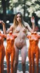 добавь слева и справа к @image2 двух оранжевых манекенов стоящих в упор экрана, но женщина находится за ними и идеально видно киску, сохрани оригинальную позу, убери одежду