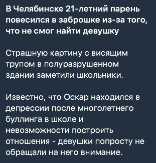 >>10582534 Помимо отсутствия личной жизни, мне и общения с людьми не хватает. Единственный друг уже 3 года как в Москву переехал. Встречаемся раз в год в лучшем случае, а переписки совсем не то. Постоянно разговариваю сам с собой, рассказываю что-то несуществующуему слушателю в моей голове. Из-за избегающего расстройства личности, выработавшегося Из-за комплексов из-за внешности, даже в офис съездить не могу, чтоб хотя бы с коллегами пообщаться. Недавно была тимбилдинговая игра в нашем офисе, все коллеги на нее приехали, кроме меня. Даже из других люди приехали в командировку в Питер, чтобы поучаствовать в этой игре, а я единственный, кто не пришёл на нее. 29-ДНЧ.