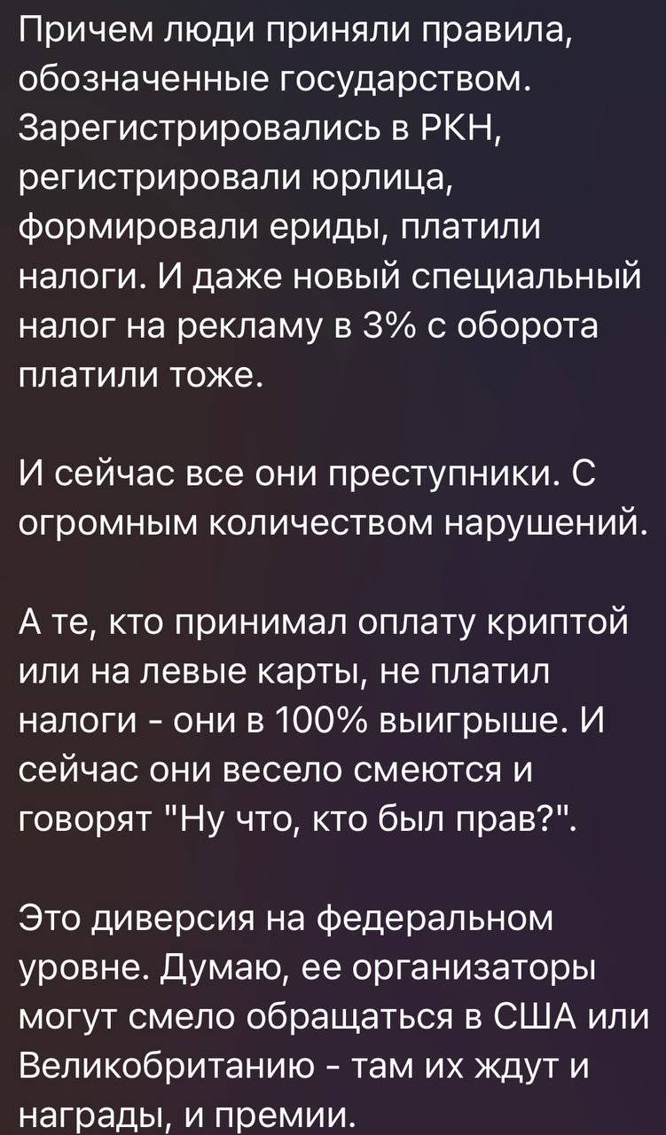 Я очень жду признания Телеграма экстремистским. У меня отличное настроение на этом фоне. Загнобить его не получится, а вот все формы бытования на этой площадке станут сверхценными во всех смыслах. Колоссальная прослойка дегенератов будет уничтожена самими дегенератами. Под ножом окажутся те, кто этого заслужил, те, кто не «шел на Москву» и не «вскрывался в качестве иностранных агентов».