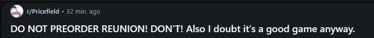 Я бы на месте Скворечников выпустил бы этот Реюньон не как отдельную игру а как длц к Дабл Экспоужар, чтобы порвать пердаки прайсфилдерам, заставив их таки купить такую ненавистную им игру (и заставить их потом коупить количеством продаж Дабл Экспоужар). Уходить так с песней!