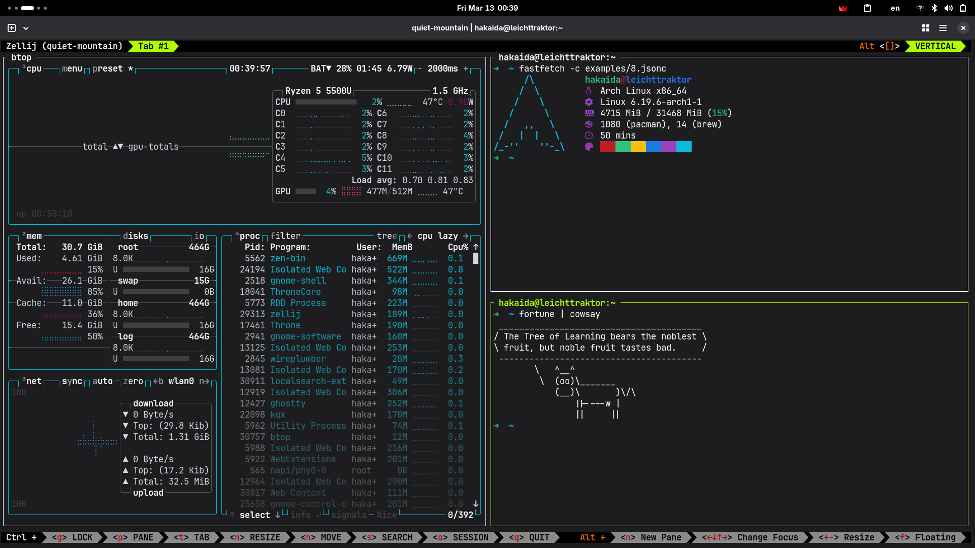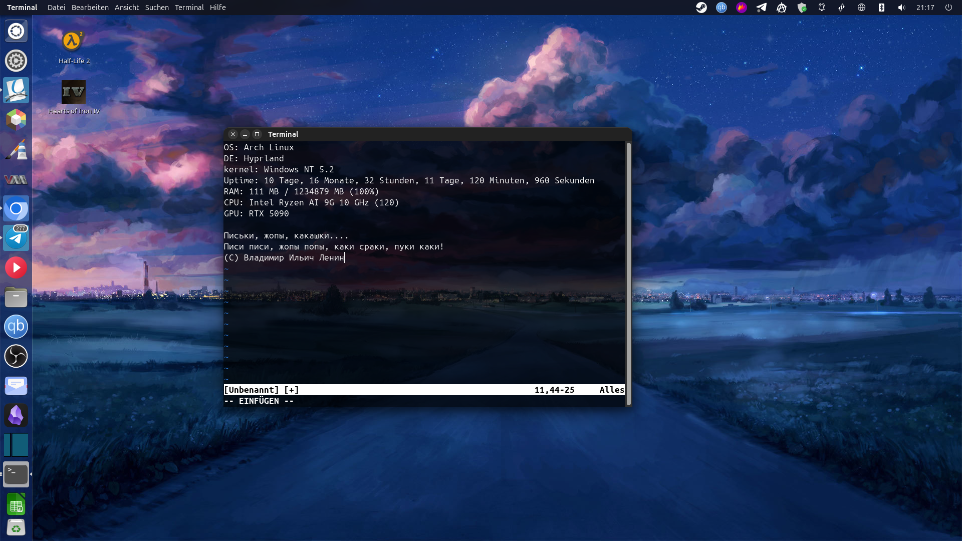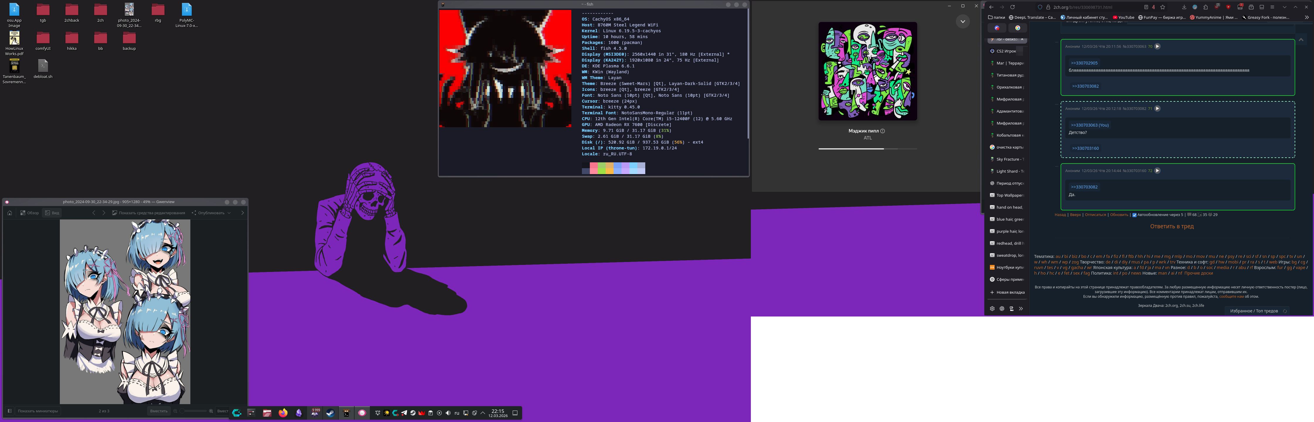 >>330717595 >Никогда не понимал прикола ставить арч, но не ставить hyprland/sway. Ну да ладно, всерно зачет Hyprland, Sway, Niri, да что угодно, это пердолинг ради пердолинга. Да, тайлинг удобно, да кастомизированно. Но сделать унифицированное окружение, хорошее по UI/UX практически анрил. Только на полноценных рабочих окружениях типа KDE, MATE, XFCE можно не задумываться о пердолинге с порталами, что у тебя обс звук выключает, что Yazi и прочие CLI это говно пердольное не умеющее взаимодействовать с другими приложениями