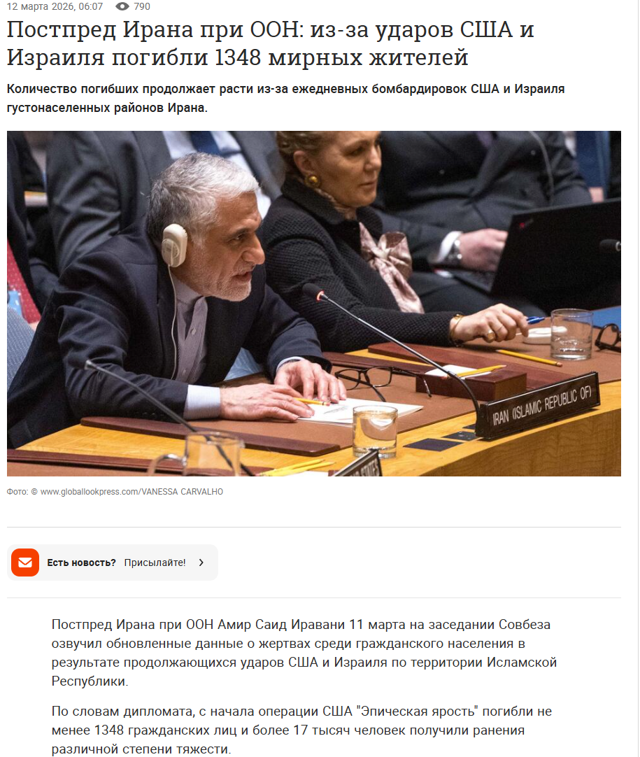 Накануне Совет Безопасности ООН поддержал резолюцию, предложенную Бахрейном, призывающую Иран к прекращению нападений на третьи страны. Этот документ, в котором не упоминается об атаках США и Израиля, был принят 13 голосами «за», при этом Россия и Китай воздержались.