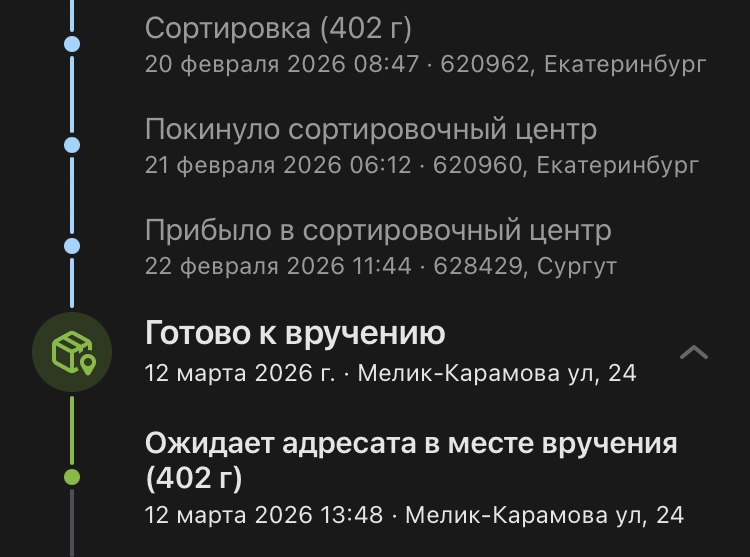 Посылки сортировали вручную, челик кинул посылку не туда, посылка уехала в другой город. Там её обнаружили отправили обратно откуда она приехала, а оттуда уже по месту назначения.