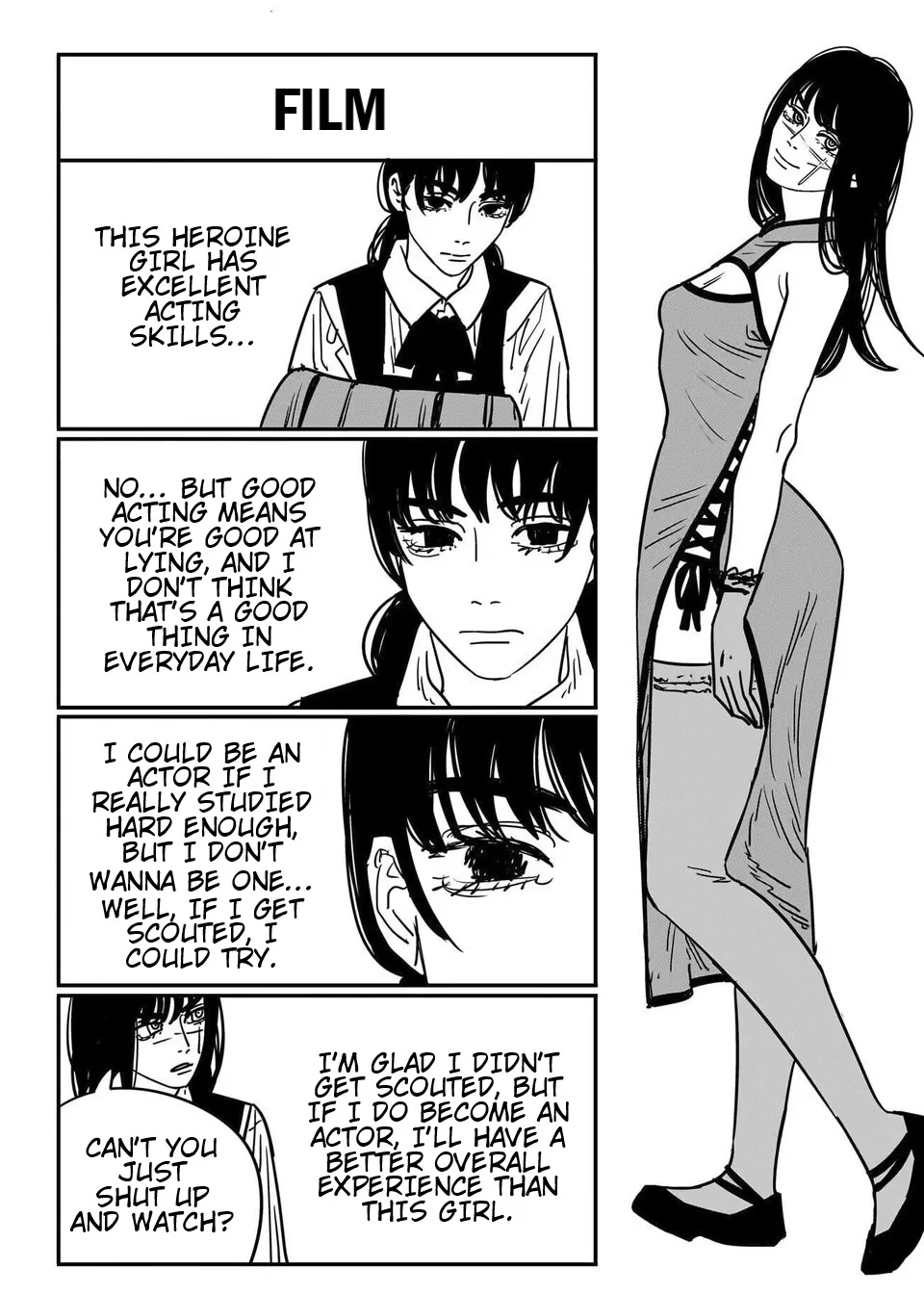 Когда новую главу открыл охерел. Даже прошлую пересмотрел, потому что мне показалось, что какую-то главу перед этим пропустил, слишком все внезапно. Но как по мне это круто когда смотришь на пилу как на такую игру автора с читательскими ожиданиями, а не что это простая история. Фудзимото как и большинство творческих деятелей любят рефлексировать над тем, что они делают. Они в принципе только этим и занимаются. И пила сейчас в особенности это не манга про дэнчика итд, а такая возможность увидеть себя как читателя со стороны, как нас видит сам фудзимото