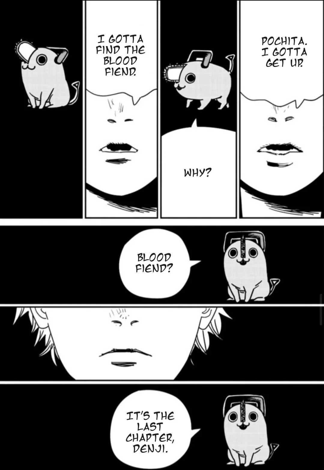 В защиту Почиты: они были, блин, мертвы, и другого выхода не было. Их сожрали, Почита ясно даёт понять, что их совместная жизнь окончена. Насекомые полностью их одолели. Ни победить, ни вернуться из этого было нельзя. Почита смог бы оправиться, он же дьявол. Денджи - нет, если он умрёт, то умрёт по-настоящему. Почита стёр само своё существование из реальности, чтобы спасти Денджи. Это был единственный способ. Слова Почиты о том, что он был счастливее в хибаре, больше похожи на попытку успокоить Денджи, дать ему понять, что всё будет хорошо, несмотря на то, что вот-вот должно случиться. При первом прочтении я чувствовал то же, что и все. При перечитывании понимаешь, что это огромная жертва со стороны Почиты ради спасения своего единственного друга. Меня это даже немного проняло до слёз.