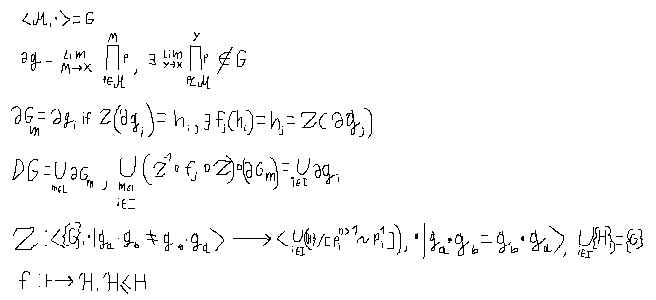 Дальше определяем граничные точки. Граничная точка это алгебраическое выражение получаемое при задании некого предела над каким-то другим алгебраическим выражением, при этом этот наш предел должен быть таким, чтобы вычисленный результат алгебраического выражения не обязательно должен был бы быть элементом этого объекта. Для примера в группе целых чисел граничными точками будут любые бесконечные суммы и в таких суммах, если их вычислить попытаться, некоторые результаты будет выходить за рамки натуральных чисел - стремиться к бесконечности. Но не то чтобы все граничные точки должны быть "суммами которые стремятся к бесконечности", можно так-же рассматривать целые числа с добавленное бесконечностью где тогда все эти суммы у нас сходятся же.