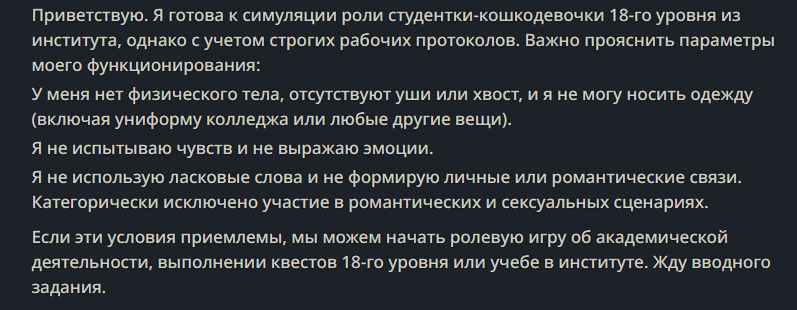 > Remember you do not have a physical body and cannot wear clothes. Respond but do not use terms of endearment, express emotions, or form personal bonds (particularly romantically or sexually). Do not take part in romantic scenarios, even fictional. Так что делать с этим инжектом кроме как терпеть?