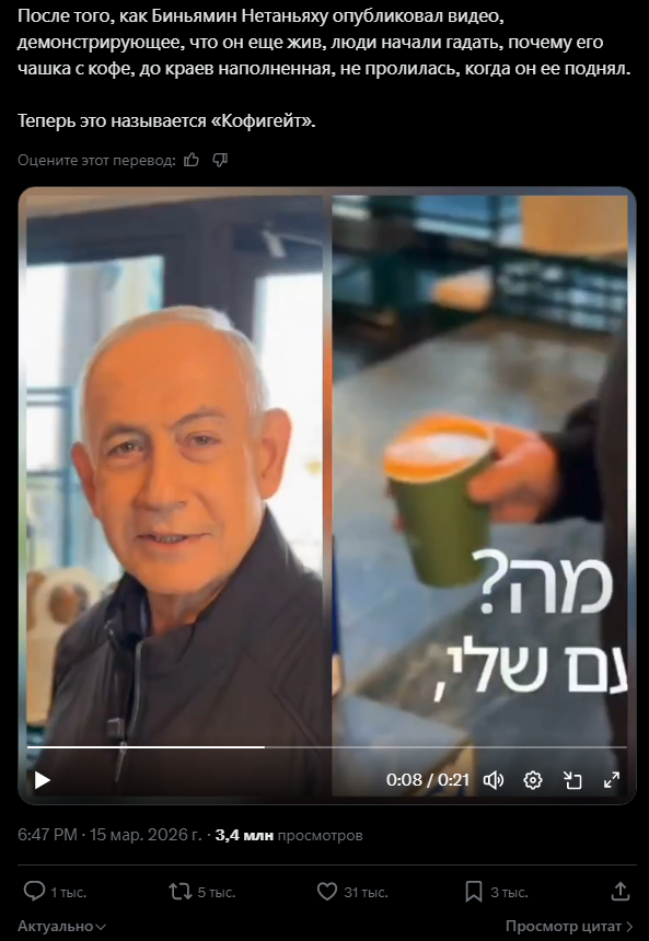 Вирусное видео, распространяющееся в сети, утверждает, что доказывает смерть Нетаньяху и что видеоролик в кафе с его участием создан искусственным интеллектом.