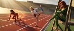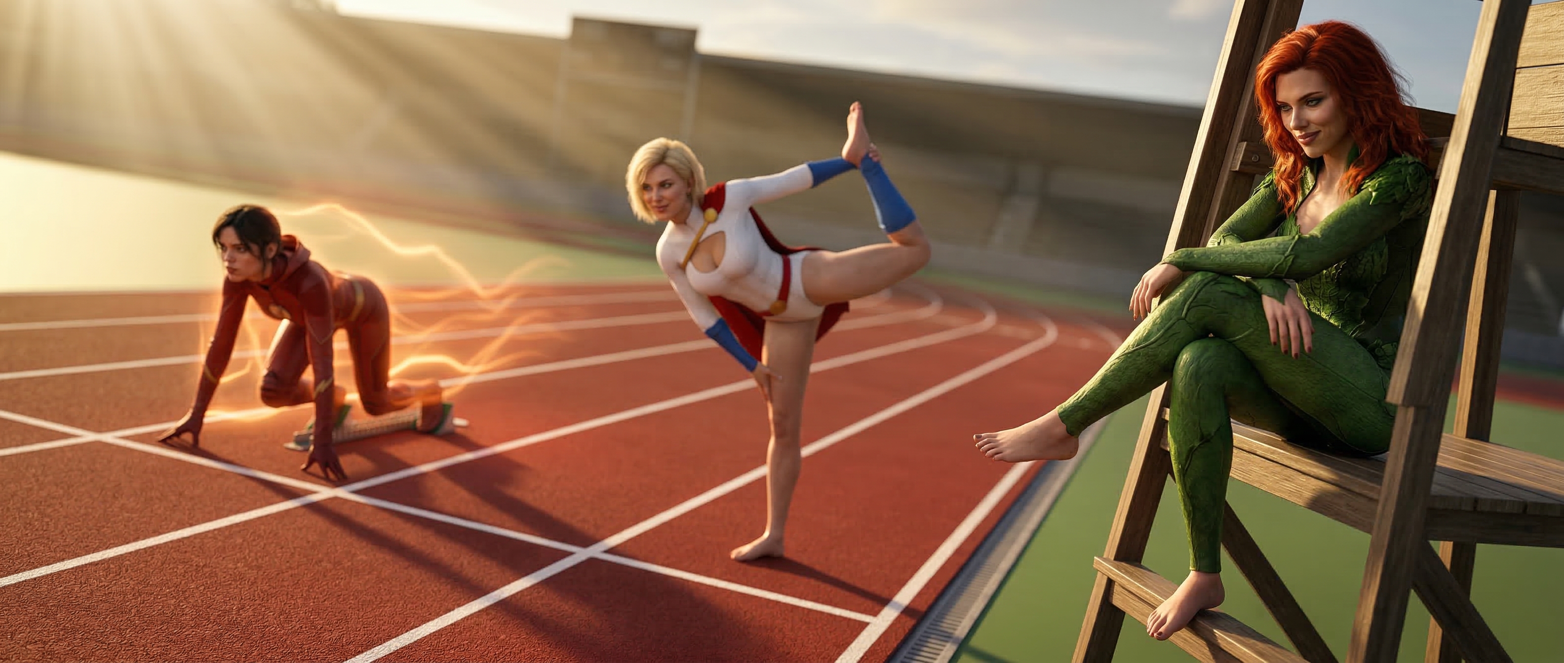 A cinematic wide-angle low shot from spectator’s viewpoint, gazing from right to left across an outdoor athletic running track arena under sunny golden hour sky. Right side of frame closer to viewer (foreground), left side deeper into the distance (background), shallow depth of field with hyper-sharp foreground focus, subtle blur on midground, softer on background. Leading lines from judge’s tower to starting line. Foreground right side: Scarlett Johansson as Poison Ivy from Arkham Knight game, fiery red hair, barefoot, sitting relaxed on judge’s tower with legs crossed one over the other (bare soles visible), smirking down at the runners. Hyper-detailed face, fingers, bare feet, toes, toenails, legs. Midground left deeper: Blonde Millie Bobby Brown as Power Girl from DC Comics, larger breasts, in stretching warm-up pose — one leg lifted high back grabbed by hand, smirking competitively towards Jenna. Highly detailed face, fingers gripping ankle, bare feet, toenails, athletic legs.Background far left: Jenna Ortega as The Flash, hood and mask off, red tight Flash suit, athletic body with round firm buttocks raised high in sprinter starting pose — one leg kicked back, fingers digging into the track, intense focused gaze forward, surrounded by glowing orange speed force lightning bolts. Detailed face, fingers, bare feet, toes, painted nails.Epic superhero race anticipation, photorealistic, ultra-detailed portraits, fingers, feet, legs, toenails, 4K UHD, cinematic volumetric god rays lighting, dramatic shadows, wide cinematic 2.35:1 aspect ratio, rule of thirds composition with depth, highly detailed textures, realistic anatomy, no distortions.