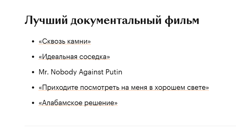 >>62141485 >Здесь вообще не упоминается. Так там нет категории "лучший документальный фильм", есть только категория "Лучший документальный короткометражный фильм". На оскаре это две разных категории. То есть они одну категорию тупа заигнорили, ссыкунишки)))
