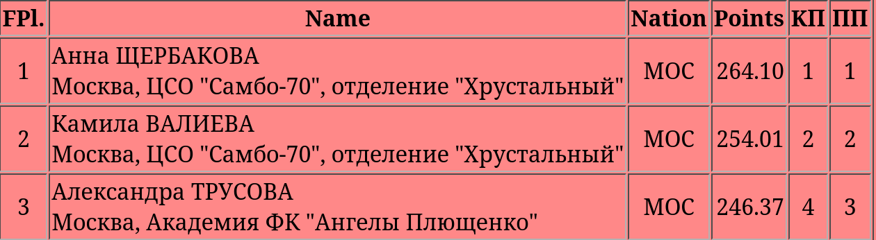 1Ариана Андранниковна АЙВАЗЯНКраснодарский край, МАУ ДО СШ "Аллигатор"КРД 2Полина Дмитриевна БОЙКОВАРеспублика Карелия, МУ ДО "СШ №6"КАР 3Варвара Александровна ВАСИЛЬЕВАСтавропольский край, МБУ ДО СШ ЗВССТВ 4Ева Андреевна ВОРОНЦОВАРеспублика Крым, "ШЗВС И. Авербуха "Наследие"КРМ 5Вероника-Виктория ГЛУШАКВолгоградская область, ГАУ ДО ВО "СШ по ЗВС"ВОЛ 6София Сергеевна ГРИШУНЬКИНАВоронежская область, АНО ДО СШ «Лед 36»ВОР 7Елизавета Андреевна ДРАЧЕВАСвердловская область,МБОУ ДО СШ №8"Локомотив"СРД 8Милана Игоревна ЖУРАВЛЕВАСамарская область, ГАУ ДО СО "СШОР №1"САМ 9Дарья Андреевна КОЛЕСНИКОВАКраснодарский край, МАУ ДО СШ "Аллигатор"КРД 10Виктория Викторовна КУЗЬМЕНКОРостовская область, АНО ДО СШФК "Профессионал"РОБ 11Дарья Васильевна ЛЕГКАЯКраснодарский край, ГБУ ДО КК "СШ по ФФК и Х", г. КраснодарКРД 12Полина Евгеньевна МАРТЫНЕНКОМосква, ГБУ ДО МАФКК, школа хрустальныйМОС 13Виктория Юрьевна МОКРУШИНАПермский край, МАУ ДО СШОР "Орлёнок"ПРМ 14Елизавета Васильевна НИКОЛАЕВАМосковская область, УОР №1, АФК"Ангелы Плющенко"МОБ 15Полина Алексеевна НИКОЛЕНКОЛипецкая область, МАОУ ДО "Спортивная школа №11"ЛИП 16Валерия Романовна РОМАНОВАТверская область, МАУДО "Спортивная школа №2"ТВЕ 17Ксения Сергеевна ТАЛАНОВАЧелябинская область, МБУ ДО "СШОР "Тодес"ЧЛБ