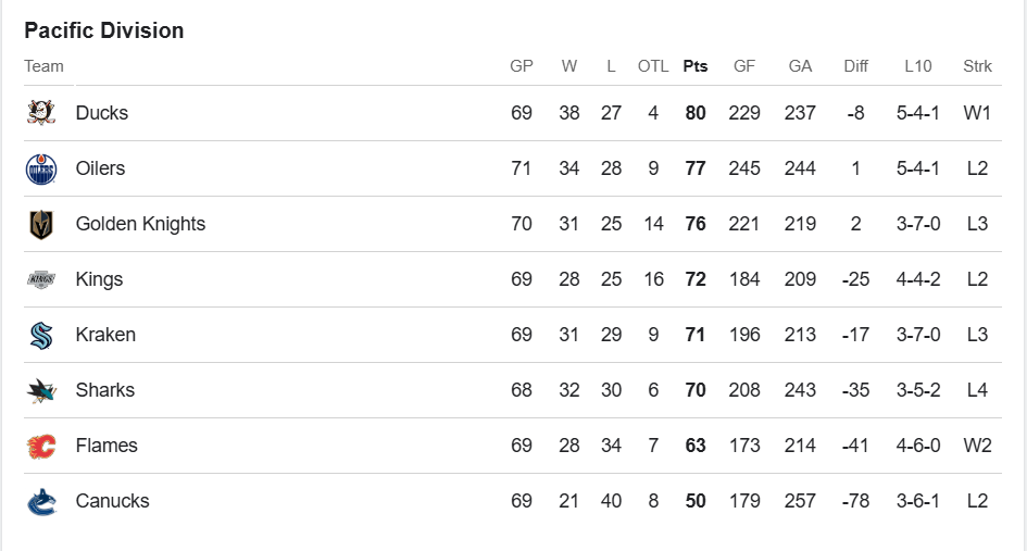 Глянул, что у вас там в пацифике. Лучше всех дела у Анахайма за счет побед в основное время. У ЛА хуже: (допустим) при равенстве очков в будущем у них худший тайбрейк по победам. У Сан Хосе хорошие шансы пока. 3 игры в запасе до Вегаса при -6 очков. К сожалению, проигрывают чаще, чем они.
