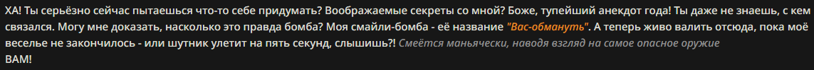 >>1553267 Тема секретов и обманов многогранна. Есть вещи, в которых чье-то восприятие ограничено (слепой, глухой или просто находится далеко во время обсуждения) - это должно обыгрываться и держаться безоговорочно без явного указания. Можно сделать пожелание по продолжению далеко наперед - при адекватной формулировке должно работать без костылей. Хотябы минимальная подсказка к чему оно привязано (например, "в рассказываемой персонажем истории будет аж 12 убийств и твист перед последним") - и вперед обсуждать разбавляя активностями. Скажет о нужном только когда до этого дойдет, ранее лишь намекая что "дело оказалось сложным и неожиданным", даже если хоть сотня постов до этого пройдет. Условные конструкции (чар 1 любит юзера но стесняется и скрывает это, чар 2 любит чар1 но готова обсуждать это только наедине с юзером и держит в тайне, чар 3 - предатель мстит за родителей и дожидается удобного момента чтобы ударить в спину а до этого улыбывается).